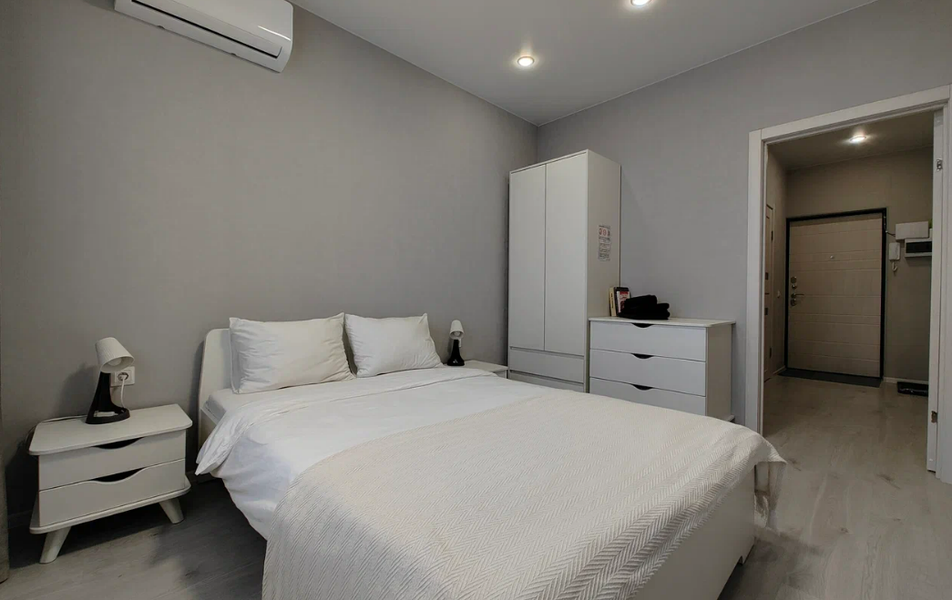 Апартаменты размещены в жилом многоэтажном доме с благоустроенной придомовой территорией. В апартаментах предусмотрена система кондиционирования, телевизор и зона для отдыха. Интерьеры выполнены в современном лаконичном стиле с нейтральной цветовой гаммой, создающей ощущение уюта и функциональности. Для самостоятельного питания оборудована кухня, поблизости расположены объекты общественного питания.