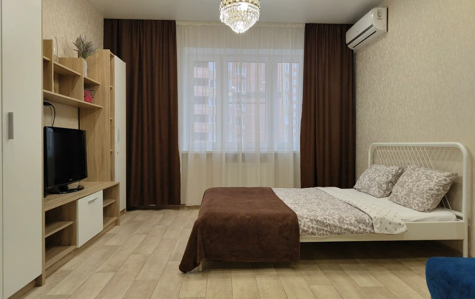 Апартаменты находятся в жилом многоэтажном доме с благоустроенной придомовой территорией. В помещениях предусмотрены санузел, система кондиционирования, телевизор и зона для отдыха. Интерьеры выполнены в современном лаконичном стиле с нейтральной цветовой палитрой, создающей спокойную и функциональную атмосферу.