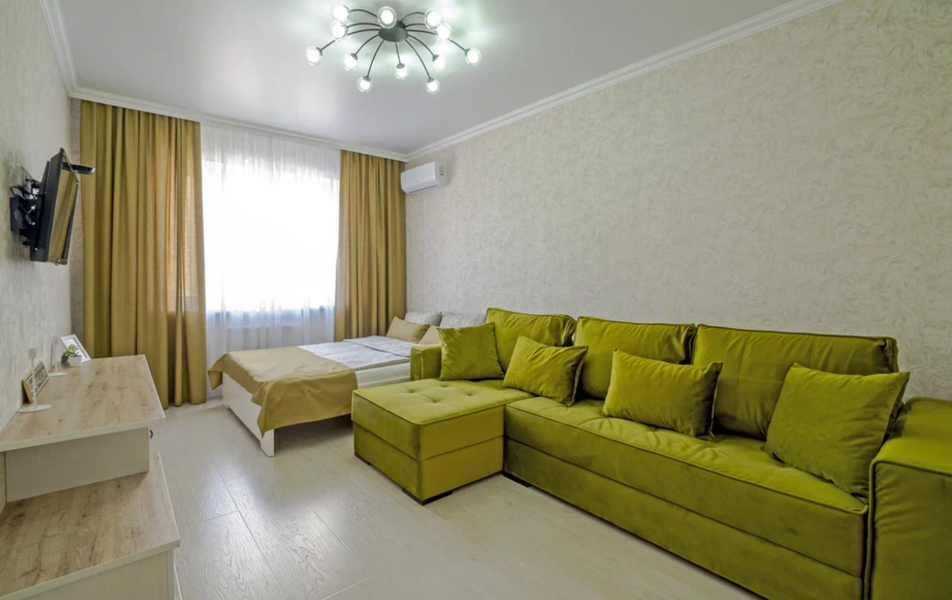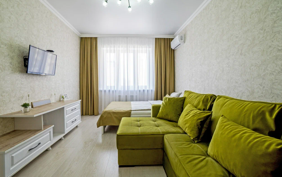 Объект размещения находится в жилом многоэтажном доме с благоустроенной придомовой территорией. Апартаменты оснащены санузлом, системой кондиционирования, телевизором и зоной для отдыха. Интерьеры оформлены в современном лаконичном стиле с использованием нейтральной цветовой гаммы.