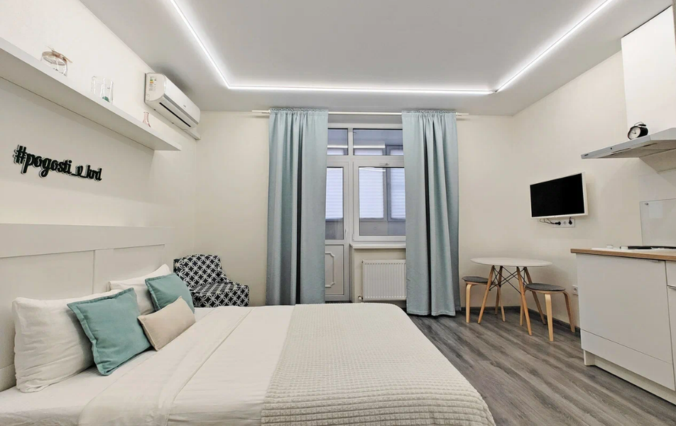 Объект размещения находится в жилом многоэтажном доме с благоустроенной придомовой территорией. Внутреннее пространство организовано для комфортного проживания и отдыха: предусмотрены система кондиционирования, телевизор и зона для размещения гостей. Интерьеры выполнены в современном лаконичном стиле с нейтральной цветовой гаммой, создающей ощущение уюта и функциональности.