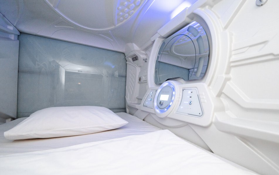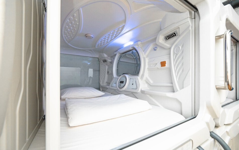 Капсула на одного человека в общем номере для мужчин и женщин. Комната 20 кв. метров на 6 мест. Космокапсула на первом уровне. От остальных гостей вас закрывает складная дверца. Есть шкафчики для хранения небольших вещей. Размер спального места 110*200 см. Высота капсулы 110 см.