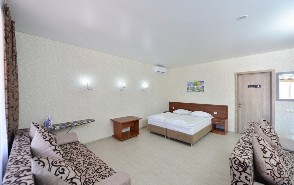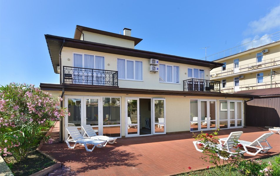 Четырехэтажный корпус гостевого дома разместился всего в 20 метрах от моря. Гостей ожидают комфортабельные номера с индивидуальным санузлом и сплит-системой, а также апартаменты с кухней. В каждом номере есть плазменный телевизор, холодильник, чайный набор посуды, доступен беспроводной интернет. Кроме того, гости могут разместиться в просторном двухэтажном коттедже, рассчитанном на 10 человек. В коттедже две спальни с собственными балконами, гостиная и кухня. Из окон коттеджа открываются красивые виды на море.
