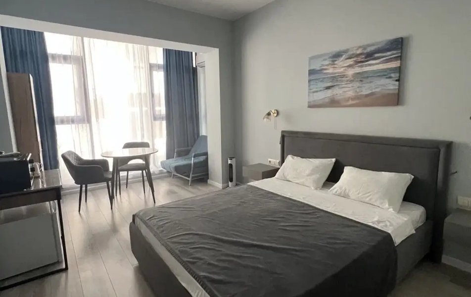 Уютная студия у моря в Курортном городке! Первая береговая линия!Всего 2 минуты пешком до пляжа! Современный ремонт, панорамные окна, комфортная двуспальная кровать и все необходимое для отдыха: кондиционер, микроволновка, холодильник, качественная сантехника и ванные принадлежности. Закрытая территория, магазины и кафе в шаговой доступности. Удобное расположение: 4 км до ж/д вокзала Адлер, 6 км до аэропорта.