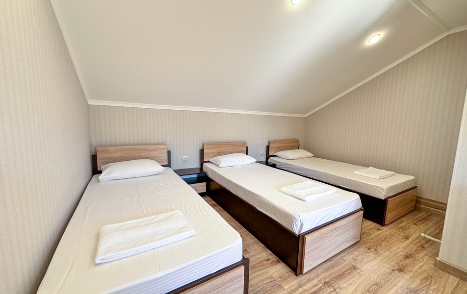 Трехэтажный корпус гостевого дома находится на закрытой территории, расположенной среди частого сектора. Уютный внутренний дворик, фасады гостевого дома, летние беседки красиво оплетены виноградной лозой. Жилой фонд, рассчитанный на 60 человек, предлагает гостям 2-, 3- и 4-местный номера Стандарт, а так же Эконом. В каждом номере есть отдельный санузел с душем, кондиционер, телевизор, в некоторых комнатах имеются балконы.