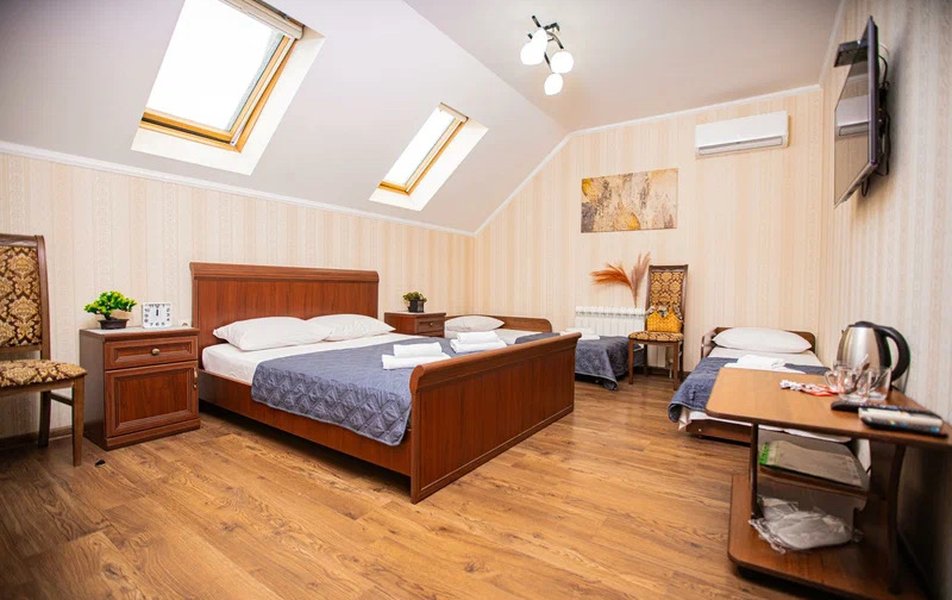 Все номера оснащены для комфортного пребывания: в каждом установлены кондиционер, телевизор, холодильник и электрический чайник. Собственный санузел укомплектован душем, феном для волос и необходимыми гигиеническими принадлежностями. На территории гостевого дома работает стабильный Wi-Fi, позволяющий оставаться на связи в любое время.