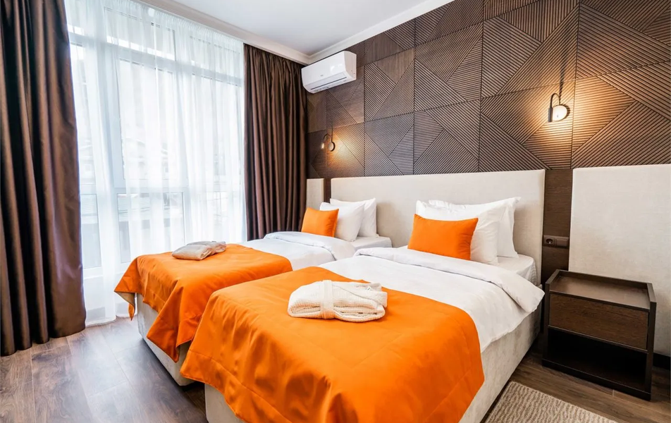 Номера оборудованы всем необходимым: от удобных кроватей, сплит-системы, мини-холодильника и современного телевидения до сейфа и электрического чайника. В гостевом доме предусмотрены полностью оборудованные санузлы с душевыми кабинами и фенами, а также удобства для отдыха: мягкие полотенца, халаты и тапочки.