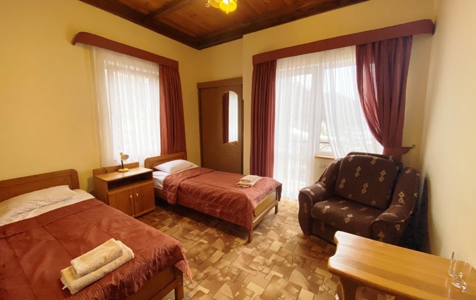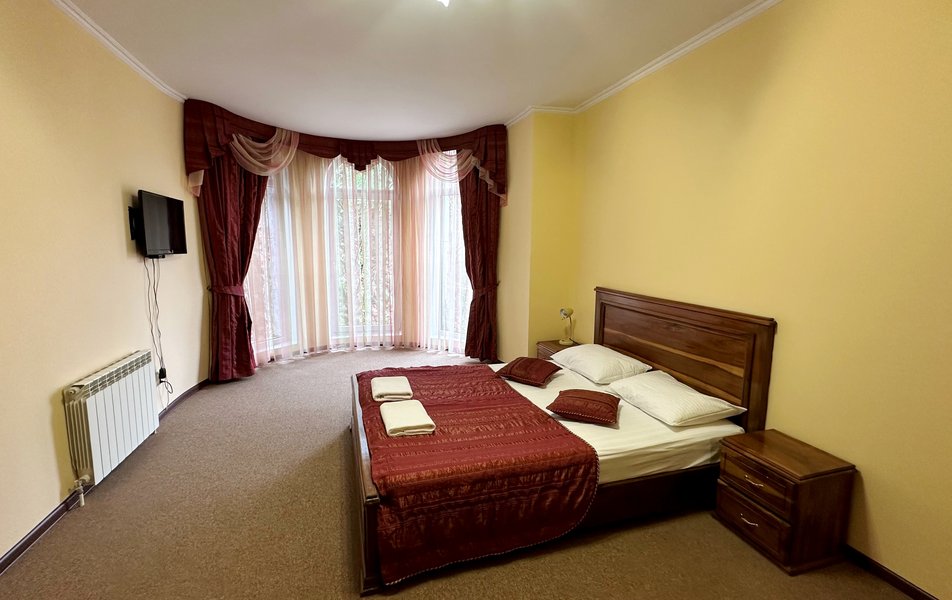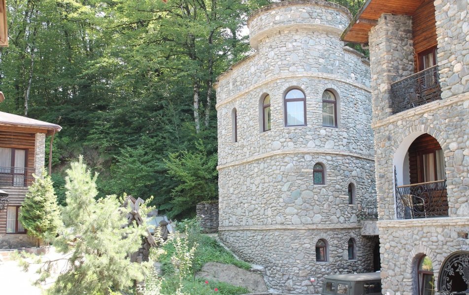 Отель занимает благоустроенную территорию площадью 3000 кв.м., на которой разместились два трехэтажных корпуса, стилизованные под средневековый замок. Здания выстроены с применением натурального камня и дерева, а вокруг разбиты клумбы и аллеи, спроектированные ландшафтными дизайнерами. Гостей ожидают номера разной категории комфорта, в том числе и апартаменты с камином. Кроме того, отдыхающие для размещения могут выбрать отдельно стоящие дома — Виллу или Сеновал. Каждый номер выдержан в уникальном дизайнерском стиле, в котором применяются различные породы древесины, например, дуб, сосна, орех, груша, липа, клен и т.д. Все номера оснащены собственным санузлом и необходимой техникой, везде есть телевизор и фен, а из большинства комнат открываются живописные виды на горы.