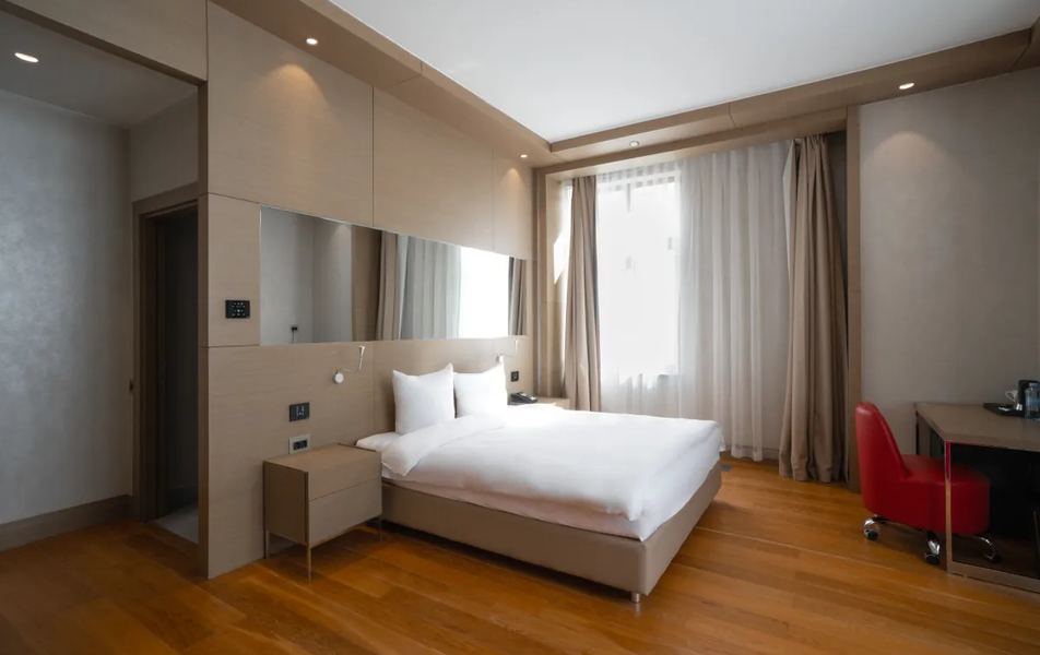 Большой номер со спальней, просторной гостиной с рабочей зоной и мягкой зоной для отдыха и кабинета, который выполняет функцию приёмной или переговорной комнаты.