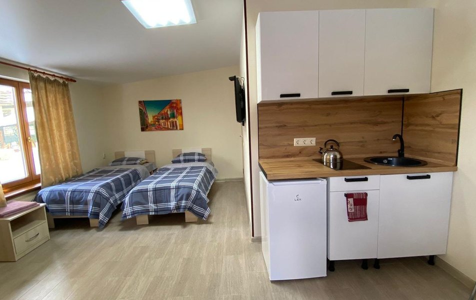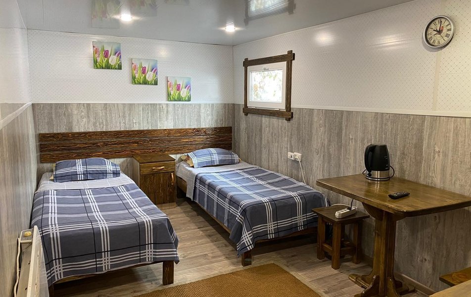На закрытой территории гостевого дома размещены просторный коттедж и девять уютных домиков, каждый из которых оборудован мини-кухней с холодильником, микроволновой печью или плитой, а также необходимой посудой. Внутри имеются современные удобства, такие как плоскоэкранные телевизоры и кондиционеры. Все номера имеют ванные комнаты с душем, а спальные места представлены как кроватями, так и диванами, что обеспечивает комфортный отдых.