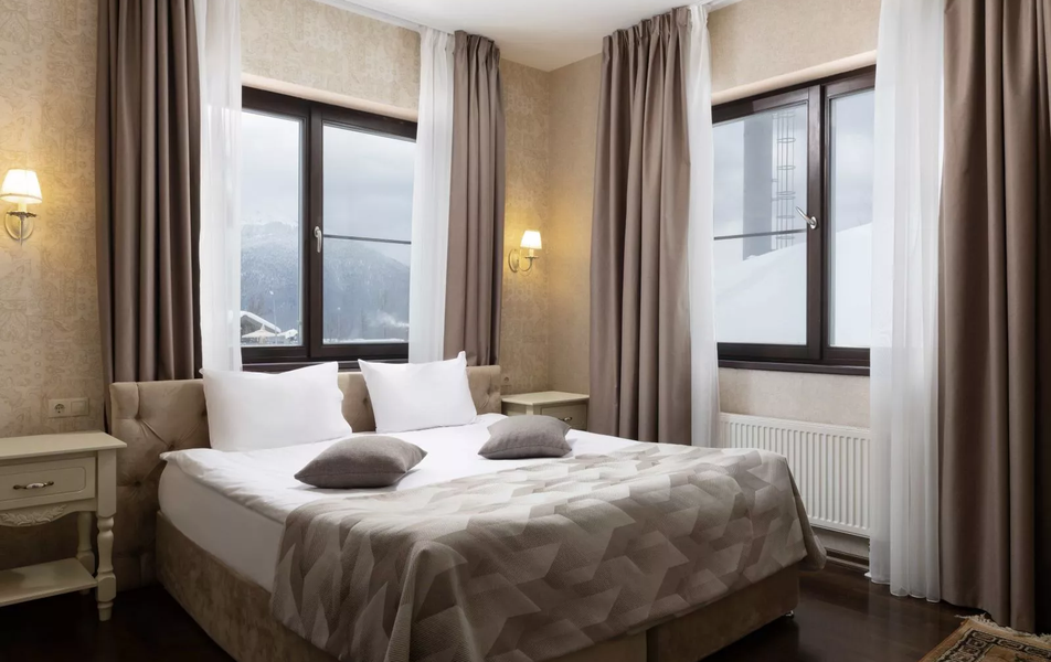 На территории комплекса работает ресторан с террасой «Вельвет», в зимний период гости могут заказать себе завтраки или перекусить в течение дня. Отель предоставляет высокий уровень обслуживания, на его территории работает круглосуточный консьерж-сервис, подключен высокоскоростной беспроводной интернет. Благодаря близкому расположению подъемников туристы за несколько минут могут спустить в Розу Долину, где их ждет масса развлечений – кинотеатры, ночные клубы, лучшие бары и рестораны курорта.