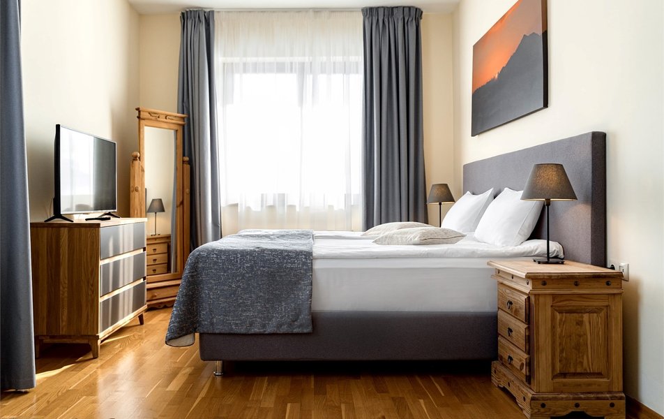 | Оборудование | кофемашина: капсульная лыжехранилище микроволновая печь набор посуды: и столовые приборы плита электрическая: с духовым шкафом посудомоечная машина телевизор холодильник электрочайник |