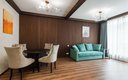 Шестиэтажный корпус апарт-отеля оснащен двумя лифтами и возвышается на главной лице поселка. Жилой фонд отеля способен единовременно вместить более 300 человек. Гостей ожидают однокомнатные номера Стандарт и Студио и двухкомнатные Апартаменты.