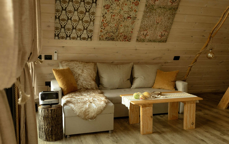 Комфортабельные домики с высокими потолками и панорамными окнами создают уютную атмосферу. Каждое жилище оснащено всем необходимым для уютного проживания, включая полностью оборудованную кухню, удобные двуспальные кровати и диваны, а также спальни на мансарде. Дополнительные удобства, такие как мягкое бельё, сплит-система и тёплые полы, обеспечивают комфорт в любое время года. Яндекс Станция с Алисой и проектор для просмотра фильмов добавляют развлечения к отдыху.