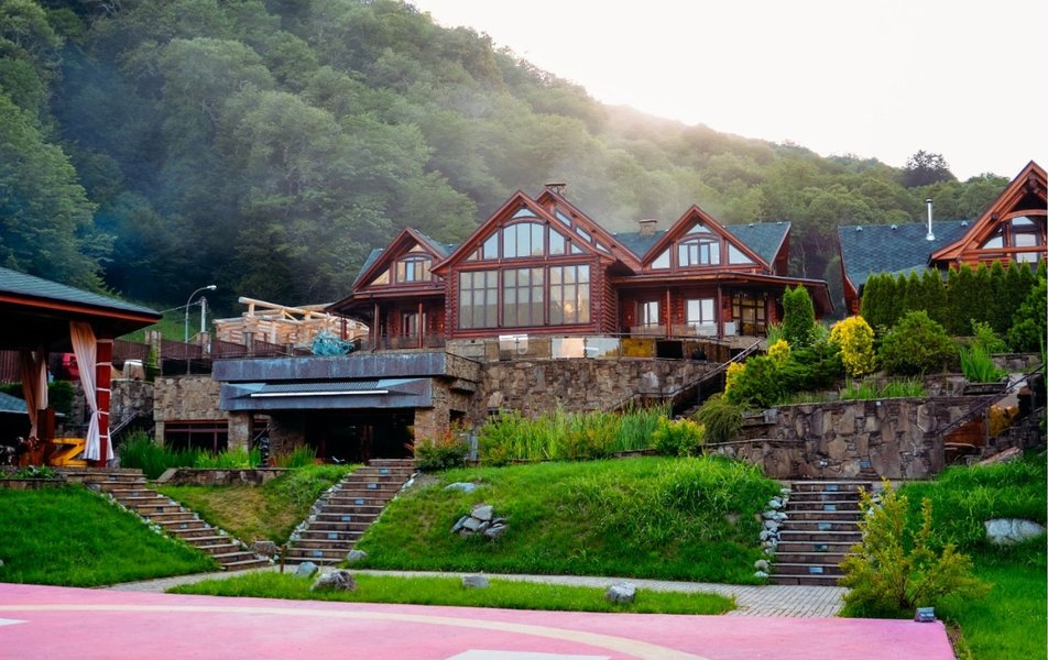 Современная резиденция расположена в самой высокой точке посёлка Красная Поляна и встречает гостей тишиной, хвойным воздухом и шумом горной речки Бешенки, протекающей рядом. До склонов горнолыжного курорта — всего пять километров, а международный аэропорт Сочи находится на расстоянии 40 километров.