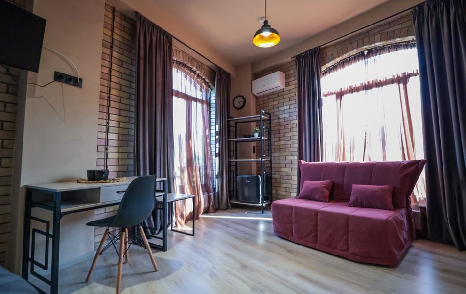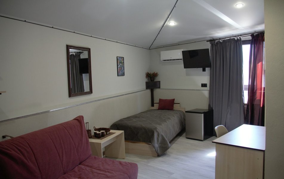 Трехэтажное кирпичное здание гостевого дома занимает небольшую закрытую территорию. В распоряжении гостей 2-х, 3-х и 4-х местные номера. Везде предусмотрен душ, кондиционер, есть телевизор, холодильник и сеть wi-fi. Из окон открываются виды на горы или лес.