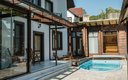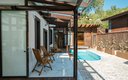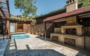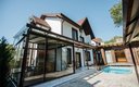 Двор дома озеленён, выполнен фасадная и придомовая подсветка. Предусмотрена парковка и видеонаблюдение по всему периметру. Обустроена мангальная зона с раковиной и рабочей поверхностью, крытая беседка с видом на горы и инфракрасными лампами для поддержания тепла зимой, а также садовая мебель. Круглогодично работает подогреваемый бассейн с зоной отдыха и лежаками. Панорамная баня открывает потрясающий вид на ущелье. В доме есть закрытая терраса.