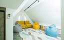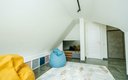 Третий, мансардный этаж зонирован на две части: в одной за массивным шкафом установлена кровать, а другая представляет собой игровую зону с двумя раздвигающимися креслами, пуфиками, настольными играми и телевизором.