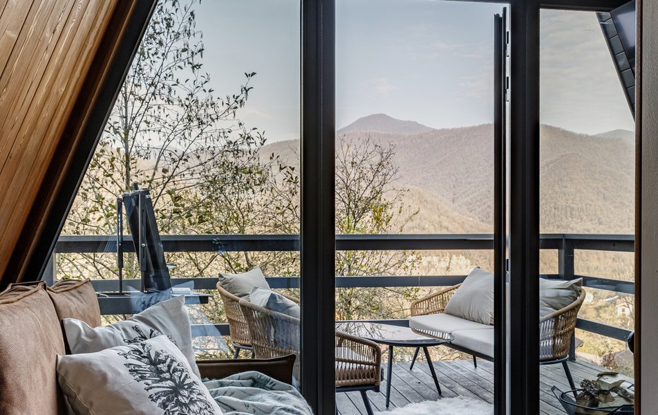 Первый этаж предлагает пространство для обитания и отдыха: уютная гостиная с раскладным диваном, обеденным столом, телевизором, умной колонкой «Алиса» и большими панорамными окнами, создающими атмосферу горного шале и ощущение свободы. Просторная терраса с комфортной уличной мебелью и мольбертом добавляет изюминку, позволяя вдохновиться природой.