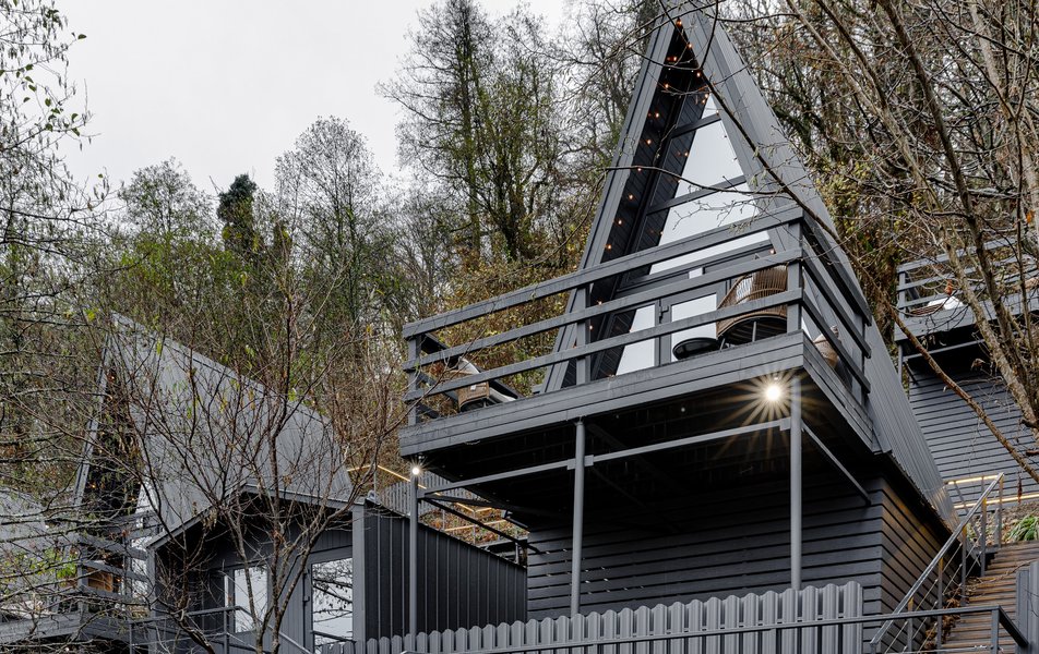 Каждый дом в стиле А-фрейм — это уютное двухуровневое пространство, оформленное с заботой о комфорте. На верхнем уровне располагается двуспальная кровать с ортопедическим матрасом, что позволяет с легкость просыпаться и засыпать в тишине.