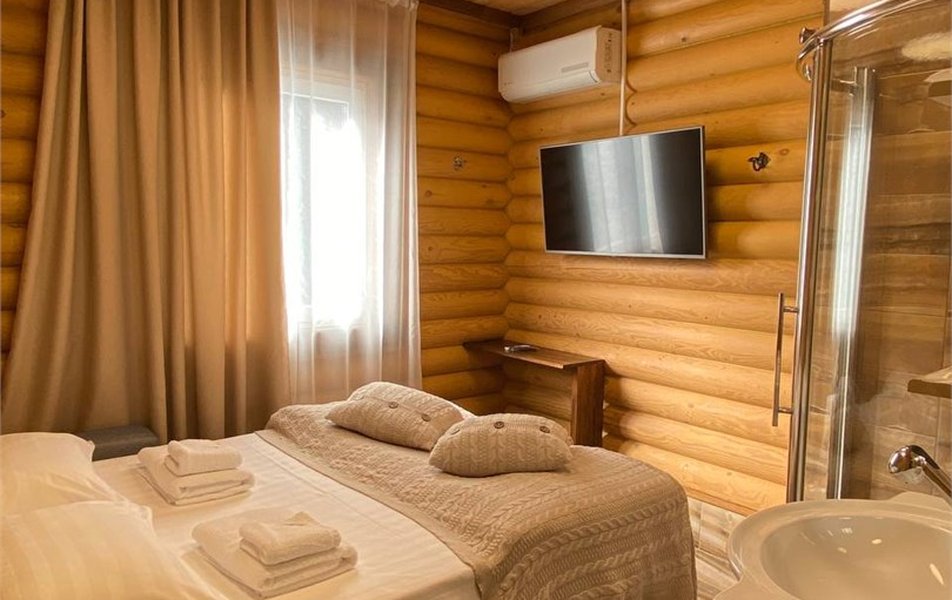 Одноэтажный, отдельно стоящий эко-коттедж с собственной закрытой территорией, тремя спальнями (в которых одна двухспальная кровать, большой диван и 2 раскладывающихся диванчика) и гостиной (оснащена мини-кухней). Удобства: русская дровяная баня 4 часа в день, финская сауна 4 часа в день ,подогреваемая купель на улице (температура воды не менее +32º), купель с холодной водой (внутри коттеджа), укомплектованная мини-кухня с УФ печью (без плиты), вместительный холодильник, телевизор, фен, сейф, душ, кондиционер, отдельная душевая кабина, утюг, гладильная доска , набор полотенец (банное, лицевое, пляжное), косметические принадлежности, собственная зона барбекю, собственная большая гостиная со столом, шезлонги у купели и качели на улице.