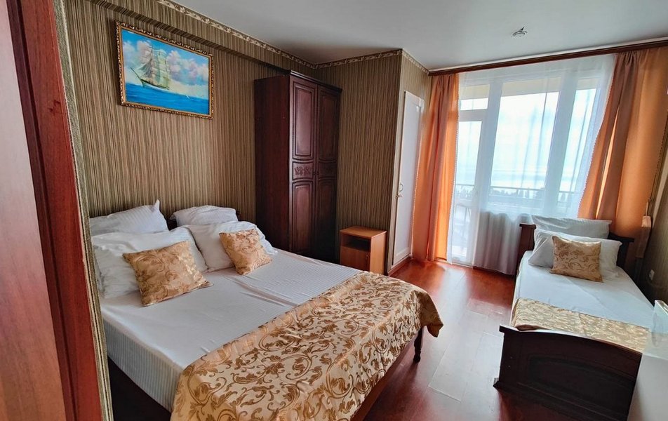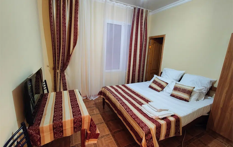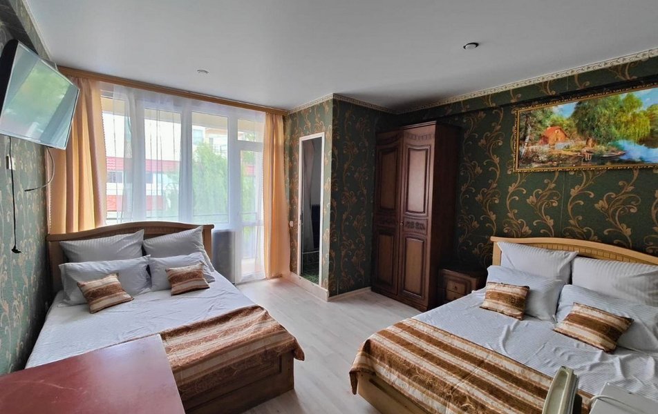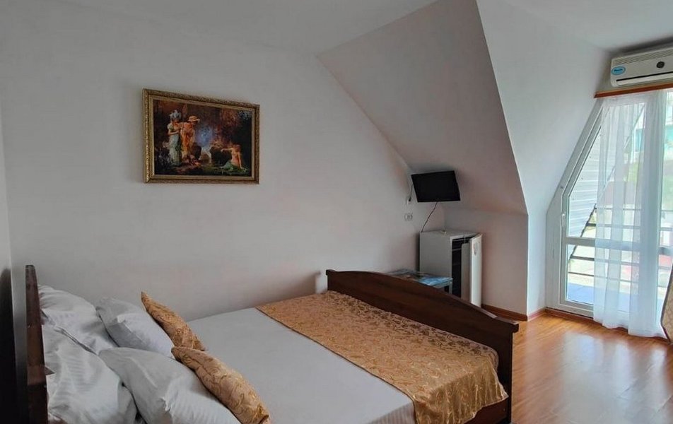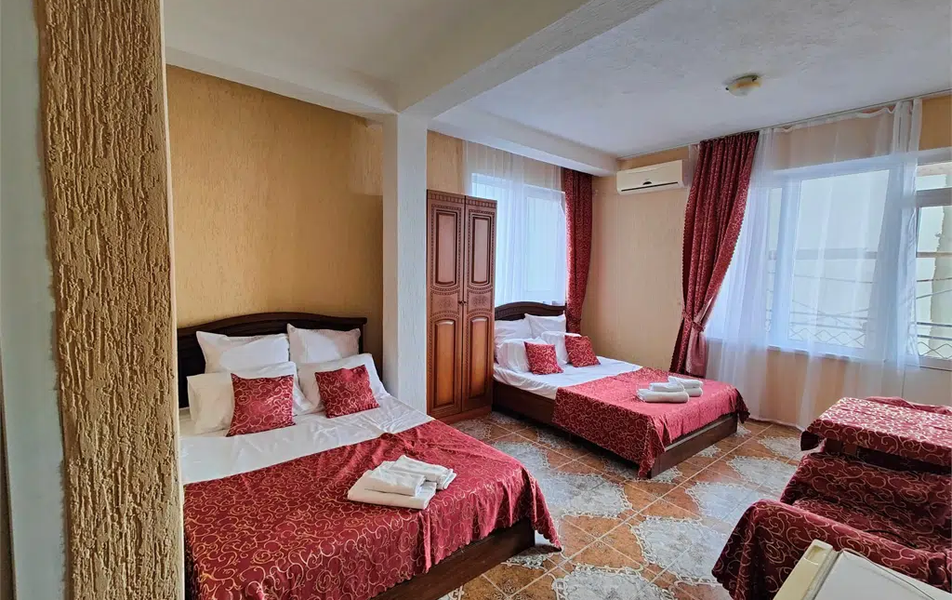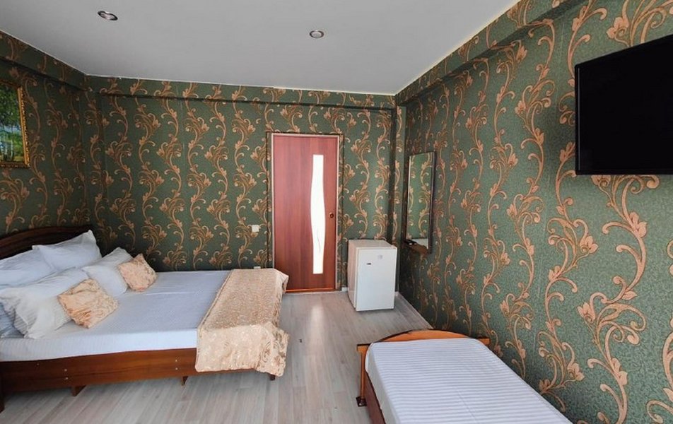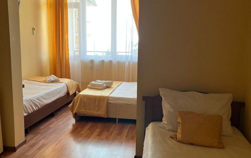 Трехэтажное здание с мансардой гостевого дома предлагает номера различной вместимости и комфортности. В каждом номере мебель, санузел с душем, балкон, кондиционер, мини-холодильник, телевизор ЖК. Номера категории Эконом без балкона с телевизором и вентилятором.