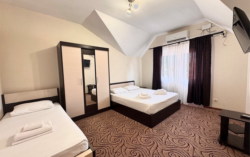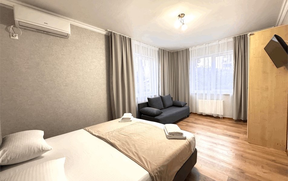 Планировка в номерах продумана с особым вниманием к потребностям гостей. Изолированные комнаты гарантируют приватность и тишину, позволяя каждому члену семьи найти свое личное пространство. Отдельная кухня — полностью оборудованная плитой, микроволновой печью, электрочайником и полным набором посуды для приготовления и подачи блюд. Санузел с ванной и стиральной машиной добавляет бытового комфорта. Отдельная входная группа обеспечивает полную автономию и независимость.