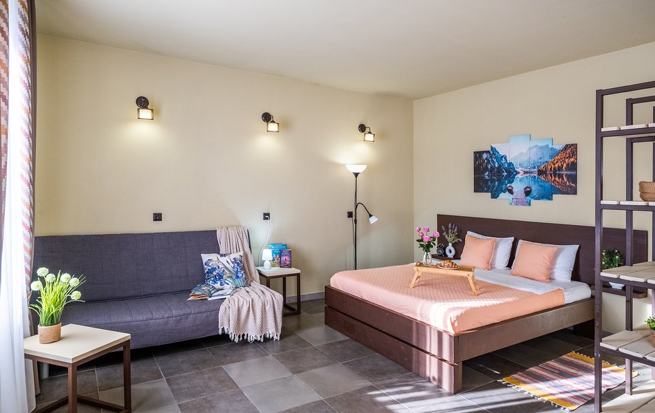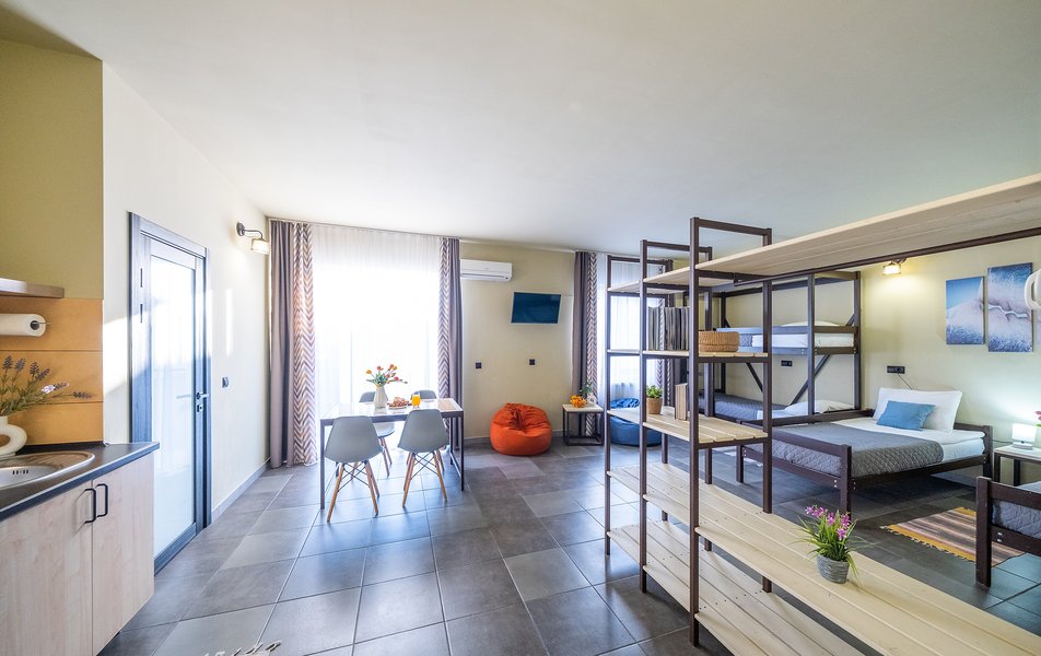 В 4-местных и 5-местных номерах есть небольшая, но функциональная кухонная зона оборудована плитой и микроволновой печью, чтобы можно было легко приготовить любимые блюда или разогреть еду. В распоряжении гостей полный набор посуды, мини-холодильник для свежих продуктов и напитков. Продуманы и бытовые мелочи, есть сушилка для белья и гладильная. Современный санузел оснащен душевой зоной и феном, а высокоскоростной Wi-Fi работает на всей территории бесплатно, позволяя делиться яркими моментами отдыха в режиме реального времени.