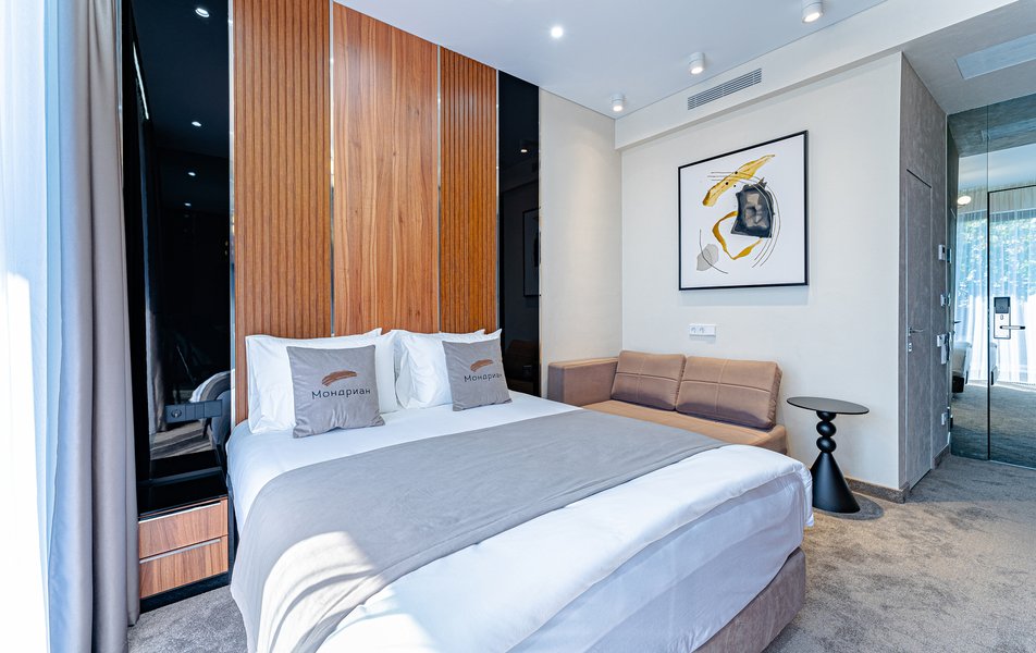 На закрытой утопающей в зелени территории гостевого дома «Мондриан» расположен открытый подогреваемый бассейн с летним кафе, установлены лежаки и комфортные беседки. В ресторане в любое время можно заказать те или иные блюда из обширного меню, детально проработанного шеф-поваром. Также к услугам гостей SPA&Wellness центр, в котором можно отдохнуть окунувшись в атмосферу спокойствия и безмятежности. На крыше гостевого дома имеется терраса с кинотеатром под открытым небом, где гости могут насладиться просмотром фильмов или спортивных мероприятий. Терраса оборудована лаундж-зонами с кальянами, патио-столами с открытым огнем и отдельным сет-меню. Любителям спорта и активного образа жизни на территории понравятся уличные тренажеры. Для юных гостей предусмотрена детская площадка с покрытием из специального материала, максимально снижающего возможный травматизм, во время активных игр. Различные качели, горки и лесенки, перекладины и домики оформлены в ярком и современном дизайне. Для автовладельцев гостевой дом оборудовал охраняемую парковку. На территории гостевого дома функционирует сеть Wi-Fi.