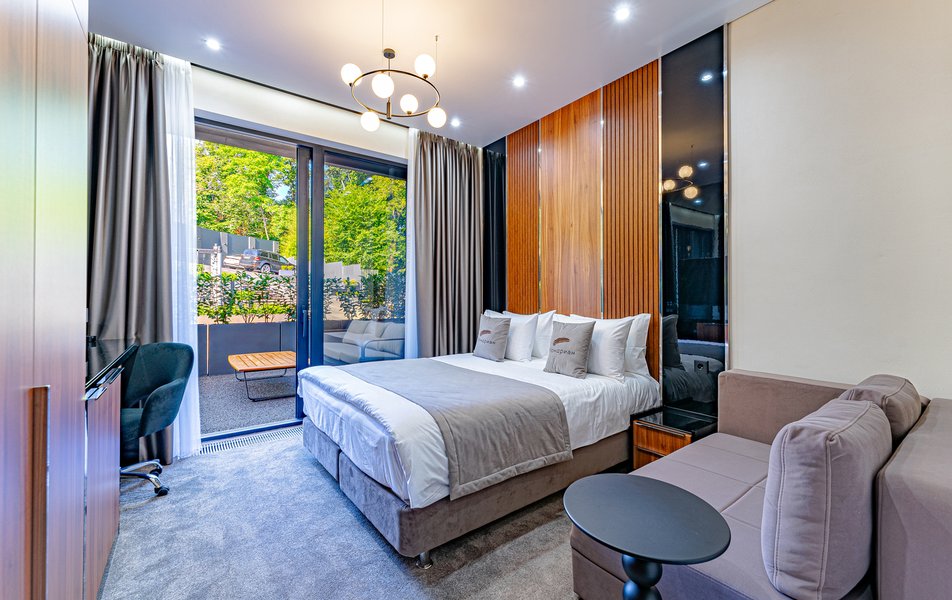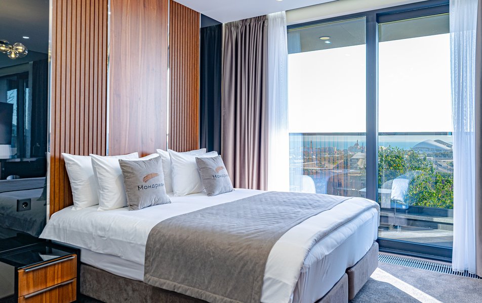 Все номера с балконами и террасами, удобными кроватями с ортопедическими матрасами спроектированы и оснащены по самым современным стандартам. В каждом номере, помимо комфортной и современной мебели, имеется ванная комната с душем и феном. Среди технического оснащения номеров можно выделить мини-холодильник, кондиционер, телевизор ЖК, сейф, кофе-машину, электрочайник, утюг, гладильную доску.