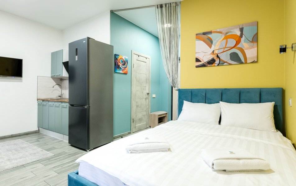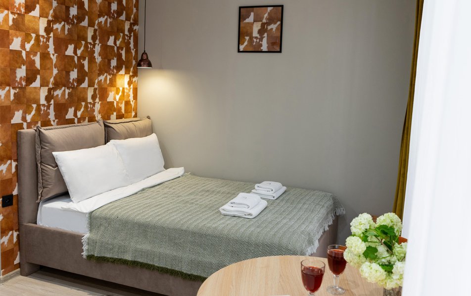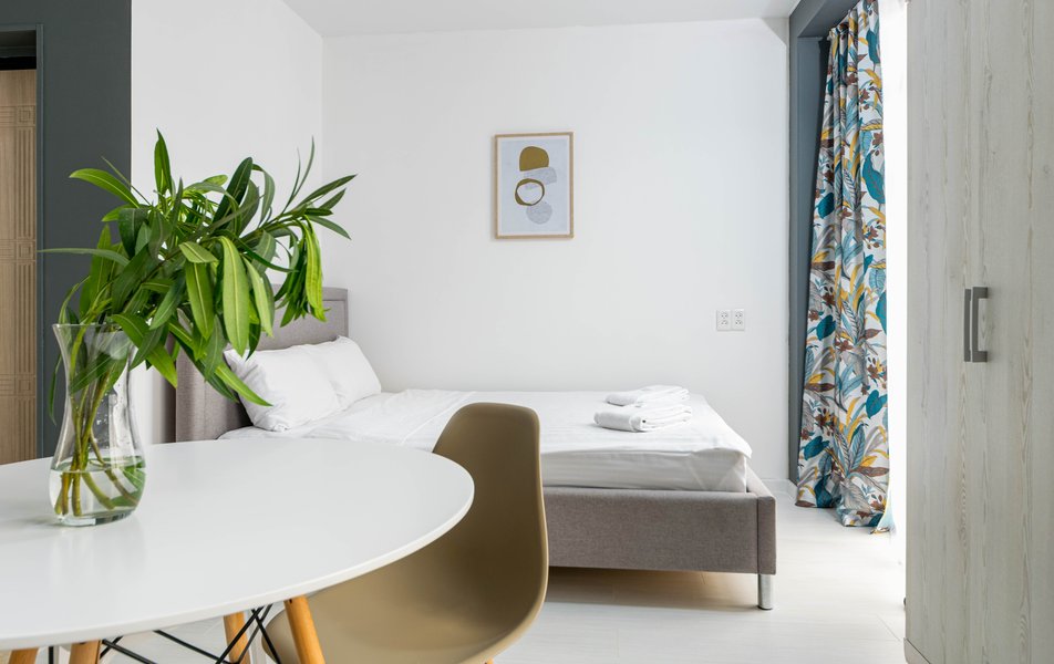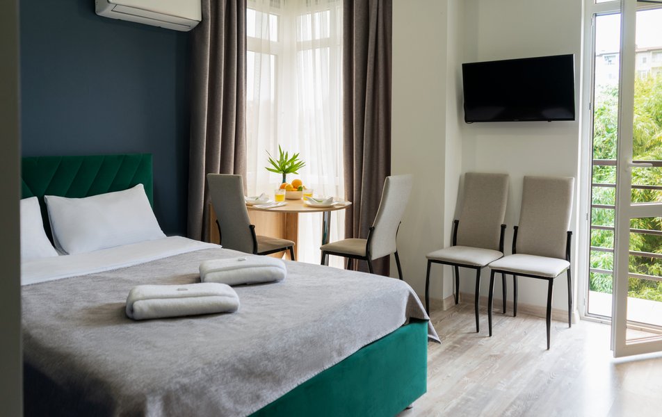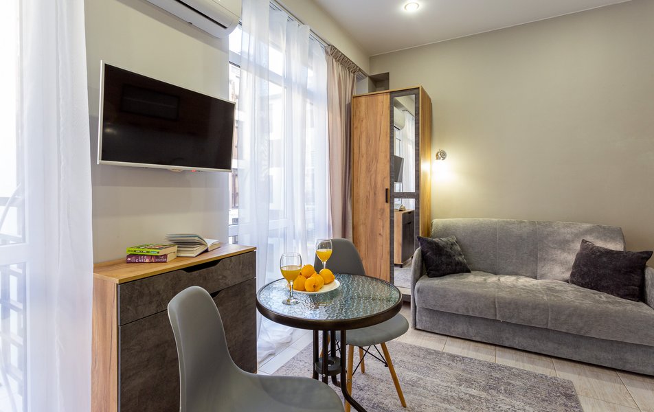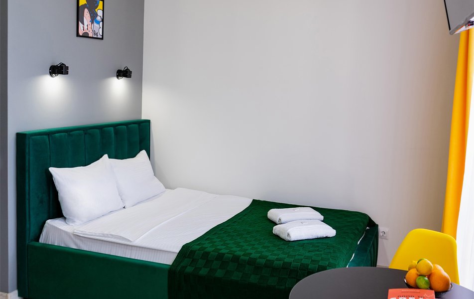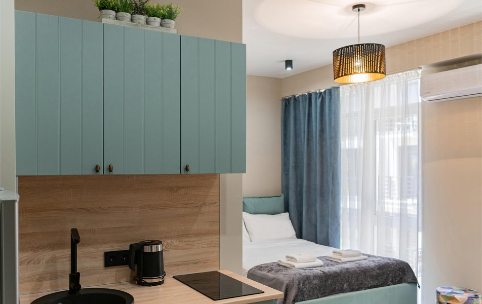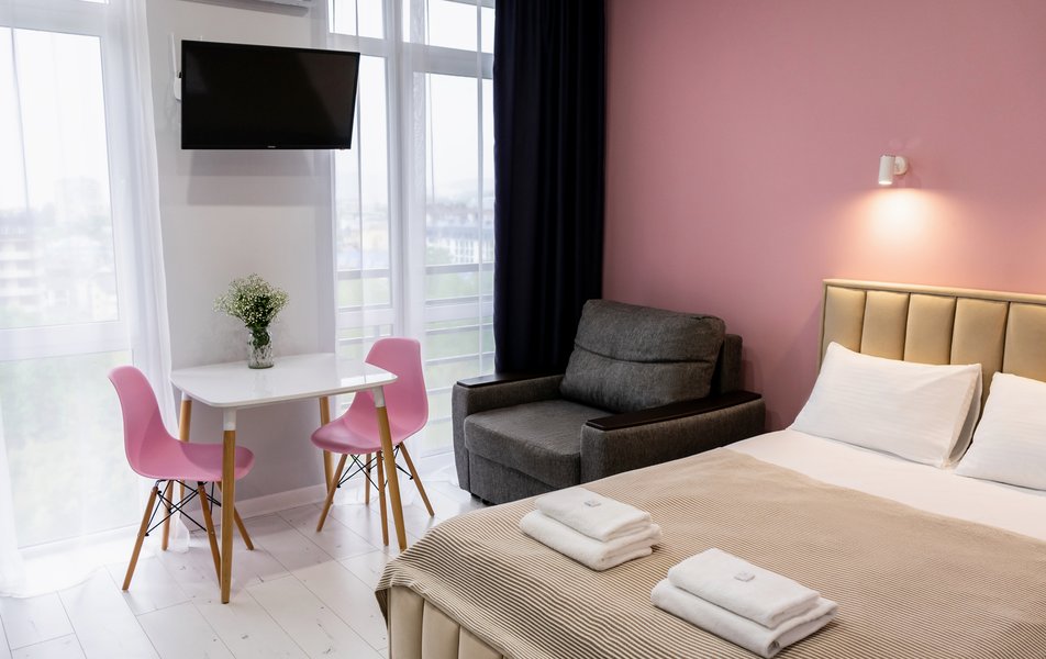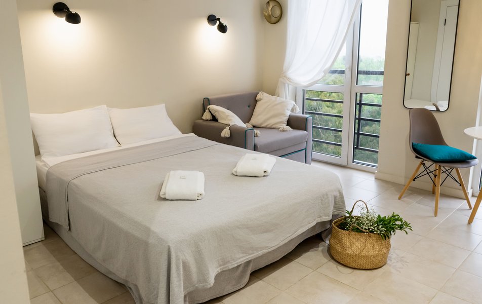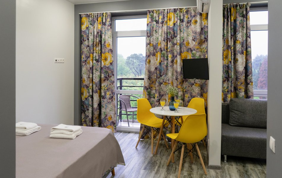 Стильные студии с современным дизайном оборудованы удобной современной мебелью, свежим постельным бельем, собственной ванной комнатой с мягкими полотенцами. В распоряжении гостей полноценная кухня со всем необходимым: холодильник, плита, микроволновая печь и посуда. Окна апартаментов выходят на бамбуковую рощу и парк «Южные культуры» — один из старейших парков на Черноморском побережье.