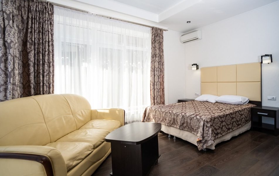 Гости категорий Комфорт и Апартаменты могут насладиться пребыванием на балконе или пространством с кухней и диваном в апартаментах с отдельной спальней. Второй этаж предлагает зону отдыха с видом на Черное море, а во внутреннем дворике установлены столы с зонтами для комфортного времяпрепровождения.