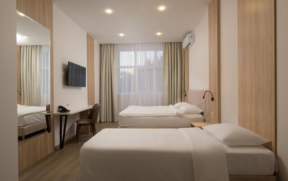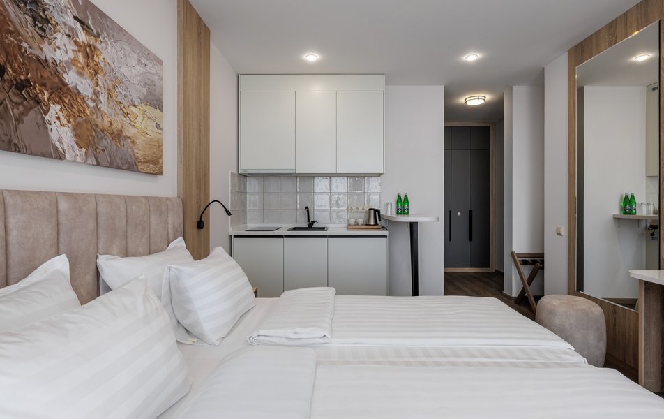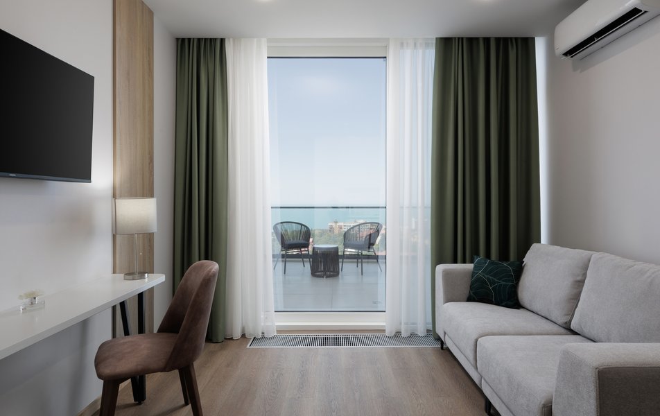 Номерной фонд отеля включает в себя номера с современным оформлением и дизайном. Для удобства гостей в каждом номере имеется кондиционер, телевизор, холодильник, сейф, гладильная доска, утюг, телефон. В ванной комнате с душевой кабиной предусмотрены все необходимые косметические принадлежности, фен, халат, тапочки. Из окон открывается потрясающий вид на горы и море. Каждый гость может воспользоваться электрической плитой, чайной станцией и набором посуды для самостоятельного приготовления еды на кухонной зоне, которая оборудованная в каждом из номеров.