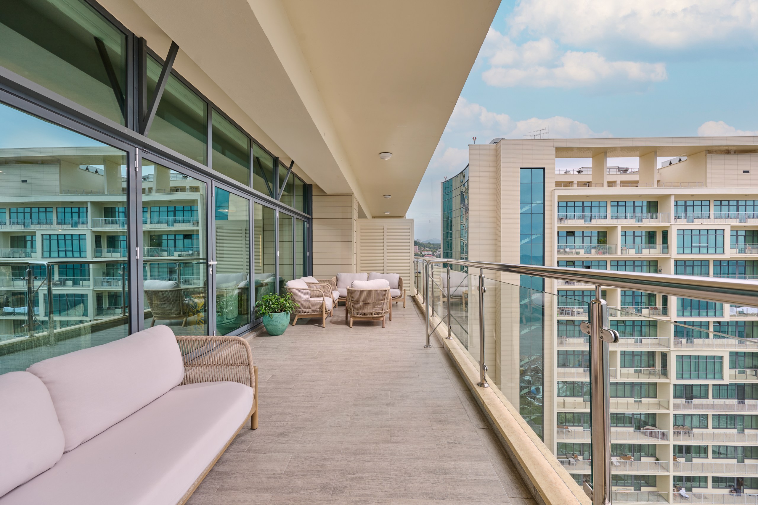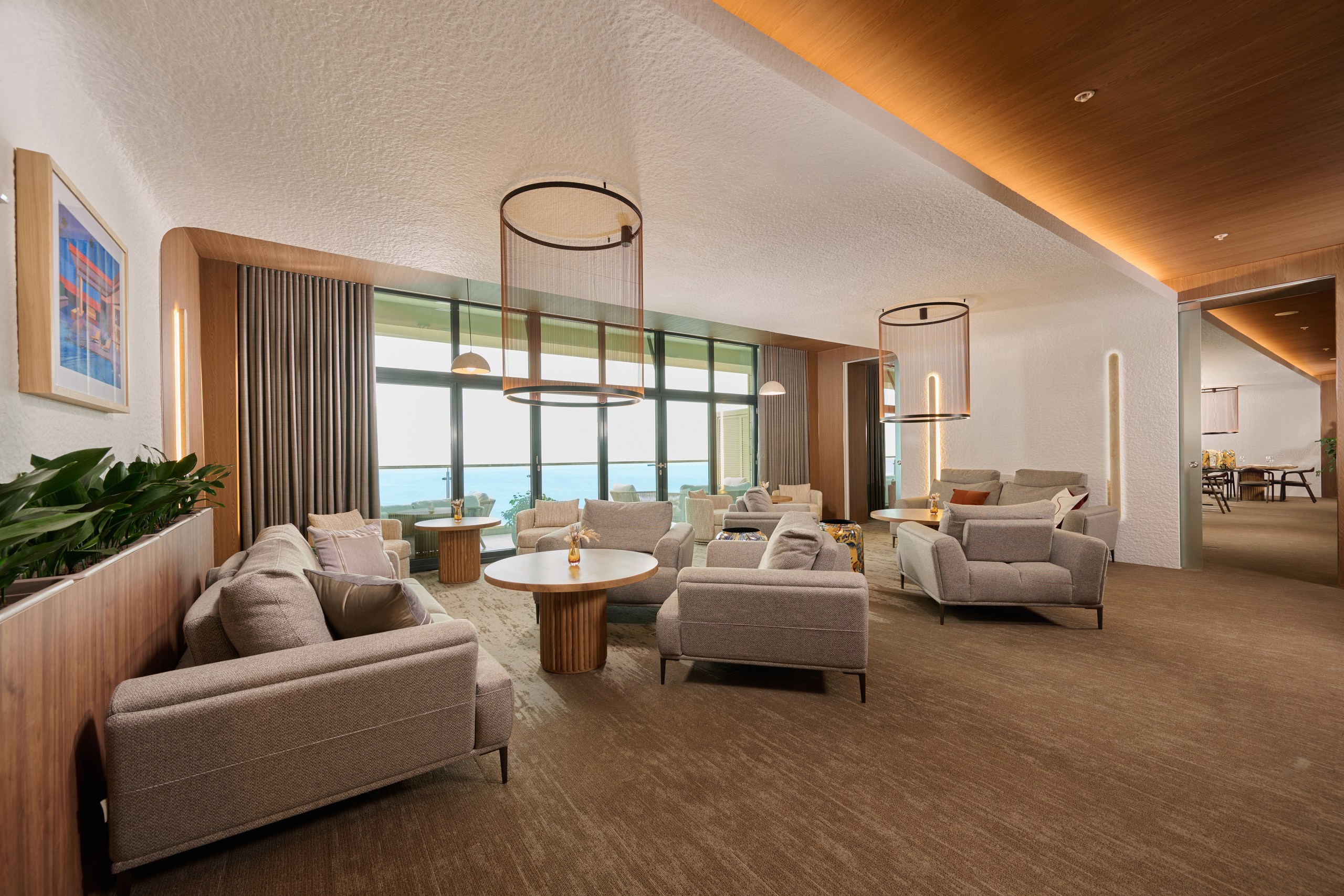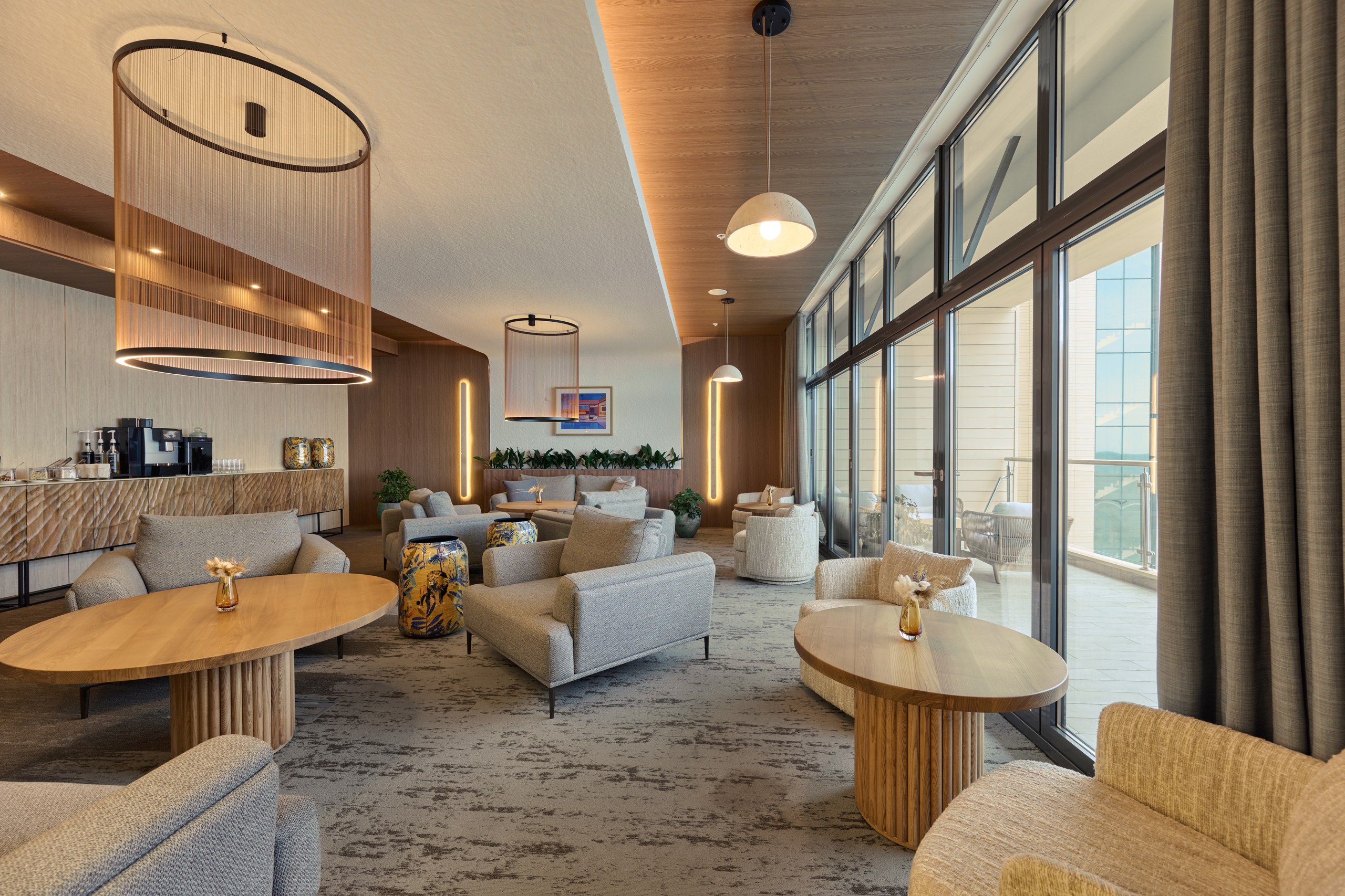 Представляем обновлённое пространство клубной гостиной на 13 этаже, где панорамные виды на море сочетаются с изысканным дизайном и безупречным комфортом. Здесь создана идеальная атмосфера для работы и отдыха.