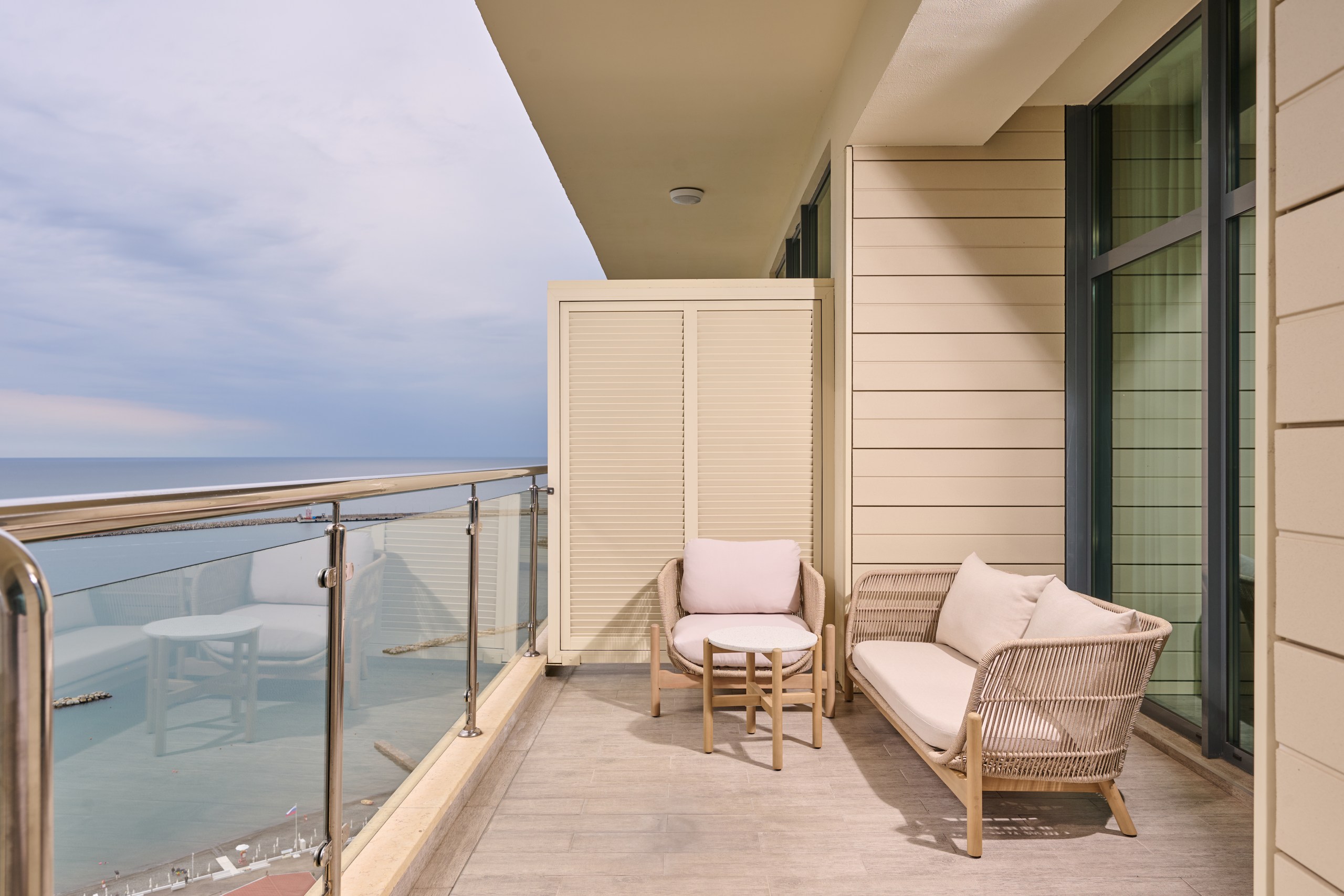 Здание отеля выполнено в современном стиле, его высота составляет 16 этажей. Для расположения гостям предлагаются 150 номеров разного уровня комфорта. Все номера оснащены собственным балконом, с которого открывается великолепный вид на море. Номера выполнены в современном лаконичном дизайне, здесь есть спальная и рабочая зоны, телефон, кондиционер, мини-холодильник, сейф, большой телевизор с кабельными каналами. В ванной комнате для гостей предусмотрен комплект полотенец, халаты, тапочки, фен, а также косметические средства эксклюзивной линии.