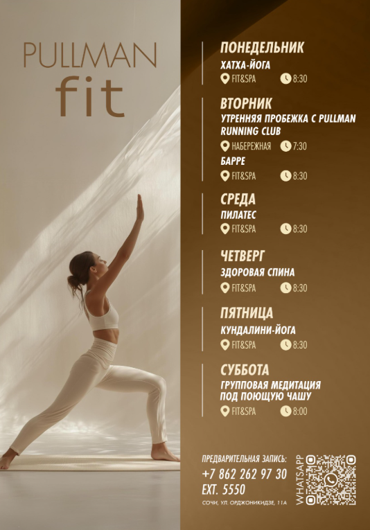 Благодаря спа-комплексу Fit and Spa by Pullman гости смогут оставаться в великолепной форме даже на отдыхе. Постояльцам предлагается посетить тренажерный зал, сауну, турецкую парную. Комплекс Bliss Pooll & Bar включает в себя взрослый и детский бассейны, вокруг которых расположены шезлонги для отдыха и зонты от солнца. В «Pullman Sochi Centre» есть возможность организовать любую деловую встречу, благодаря высокотехнологичным конференц-центрам. Всего в нескольких минутах от отеля располагается частный галечный пляж. На закрытой, безопасной территории будет комфортно и интересно гостям любого возраста. Береговая линия оснащена шатрами и шезлонгами, где можно отдохнуть в тени зонтов, есть зоны отдыха со столиками, бар.