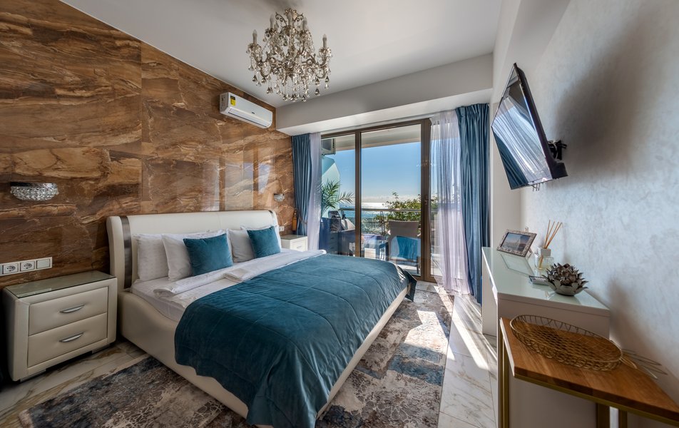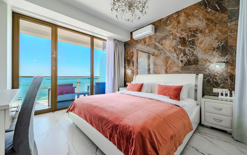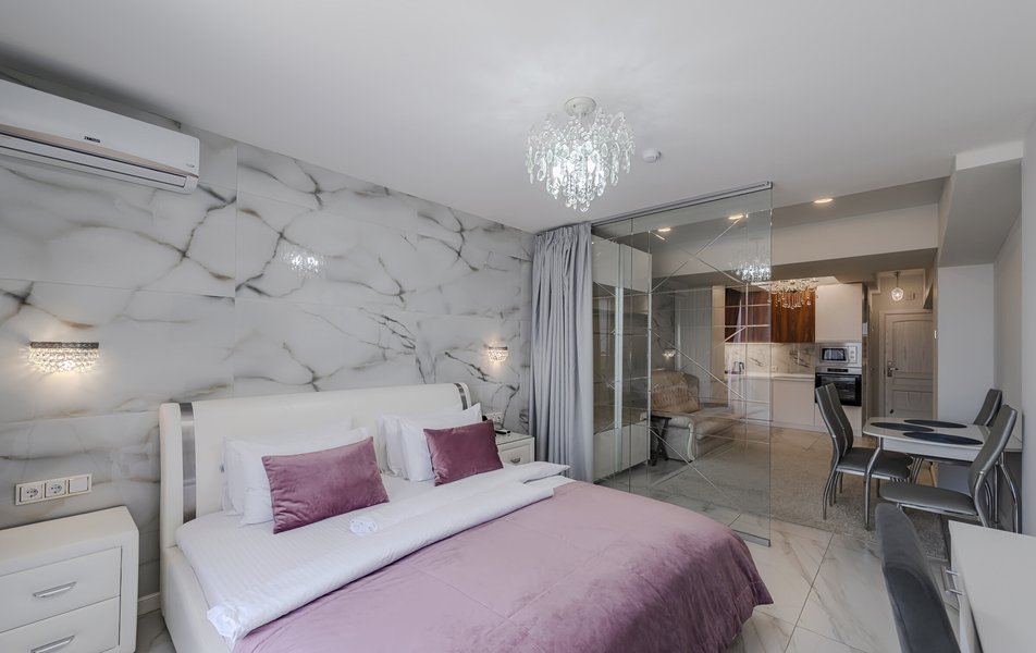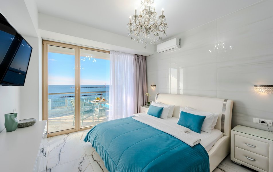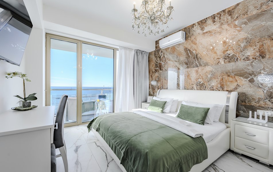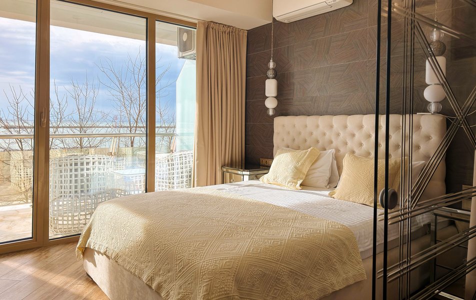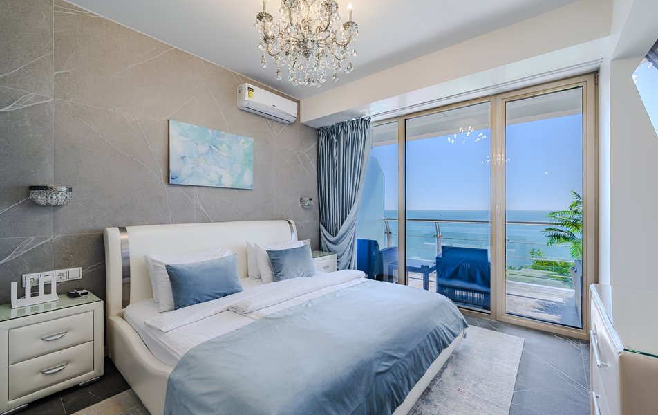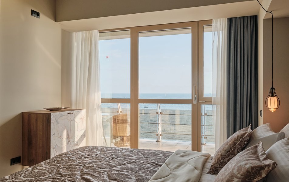 Апартаменты находятся на территории апарт-отеля на 4-м этаже пятиэтажного здания, подняться в номер можно на лифте. К услугам гостей просторные апартаменты с кухонной зоной и ванной комнатой. В номере имеется вся необходимая техника, в том числе кондиционер и капсульная кофемашина. В Апартаментах современный лаконичный интерьер, с террасы, меблированной стильным ротангом, открывается живописный вид на море.