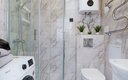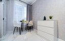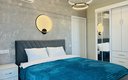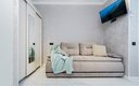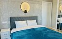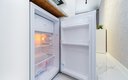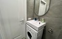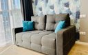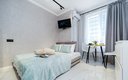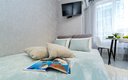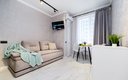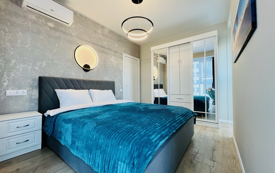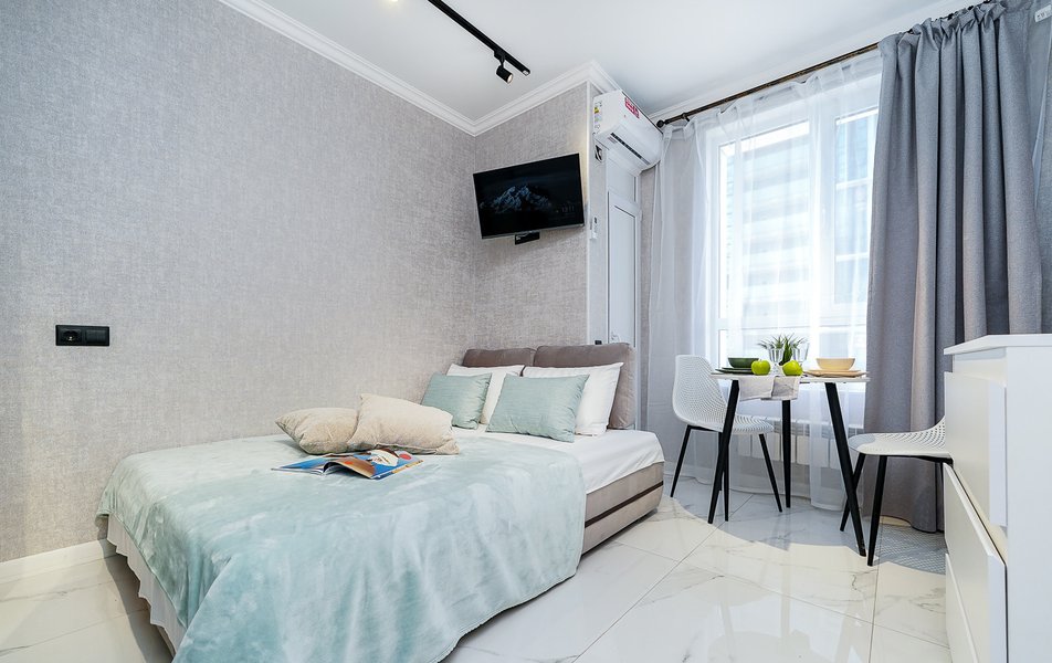 Для сна в студии на 22 м² предусмотрена одна большая кровать с ортопедическим матрасом. В варианте на 40 м² — изолированная спальня с такой же кроватью и дополнительный двуспальный раскладной диван. В обоих случаях есть вместительный шкаф для вещей, ЖК-телевизор с голосовым помощником, быстрый стабильный Wi-Fi, два кондиционера, стиральная машина, фен, утюг, гладильная доска и сушилка для белья. Совмещённый санузел оснащён душем, туалетом, большим зеркалом с подсветкой. В стоимость проживания включены постельное бельё, полотенца, разовый гигиенический набор (мыло, гель для душа, шампунь), а также средство для мытья посуды.