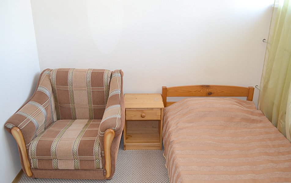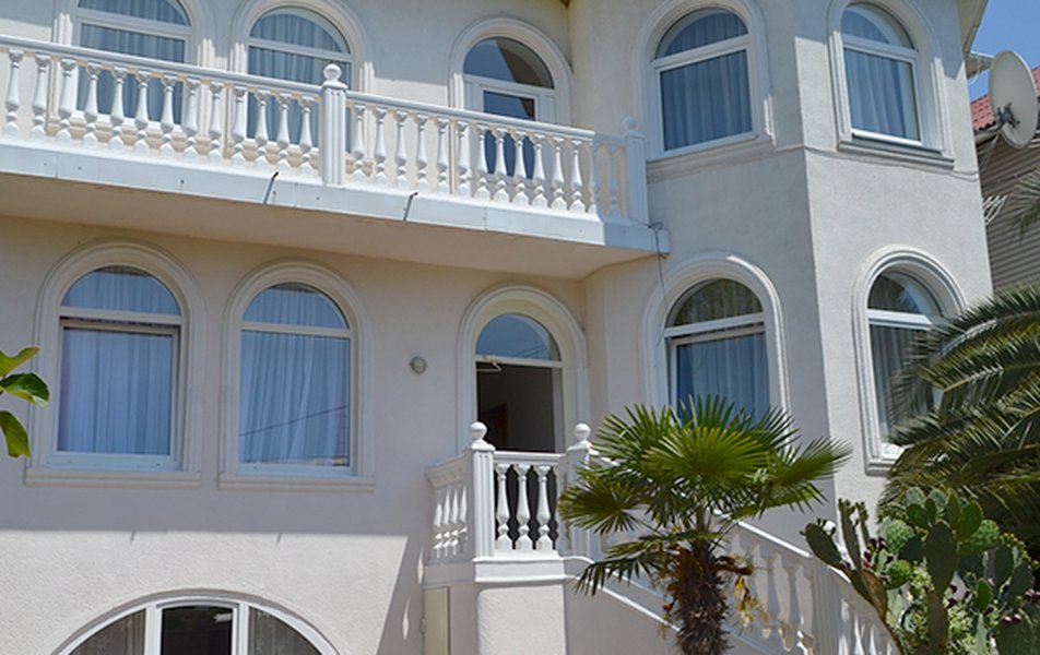 Белое здание отеля с изящными балконами и террасами, имеет три этажа и цокольное помещение. В его номерах можно одновременно разместить более 40 человек.