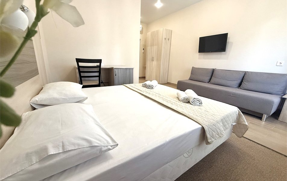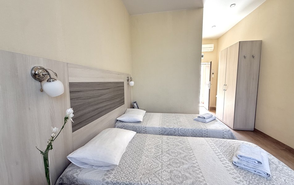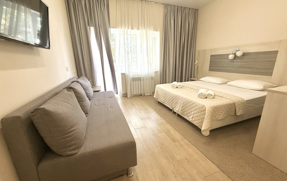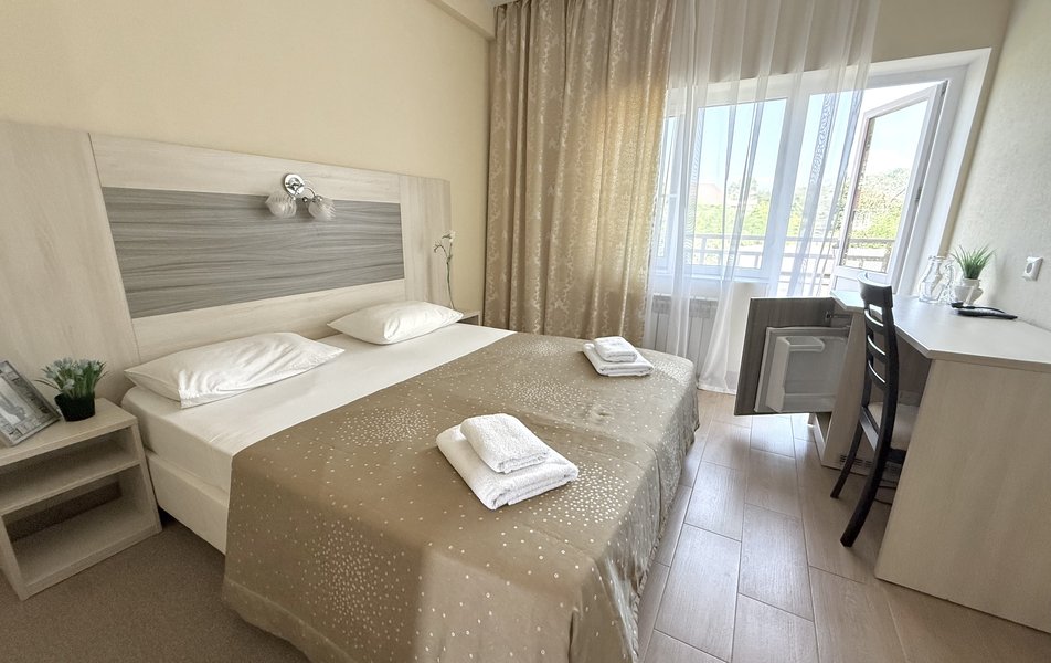 Трехэтажный корпус отеля расположен на тихой и зеленой улице. Небольшой жилой фонд рассчитан на 70 человек. Гостей ожидают номера номера различной вместительности и комфортности. В каждом номере есть санузел с ванной/душевой кабиной, кондиционер, холодильник и телевизор. Почти во всех номерах есть балкон.