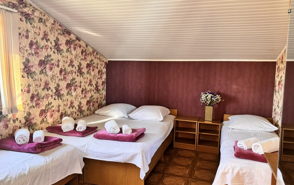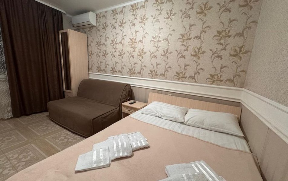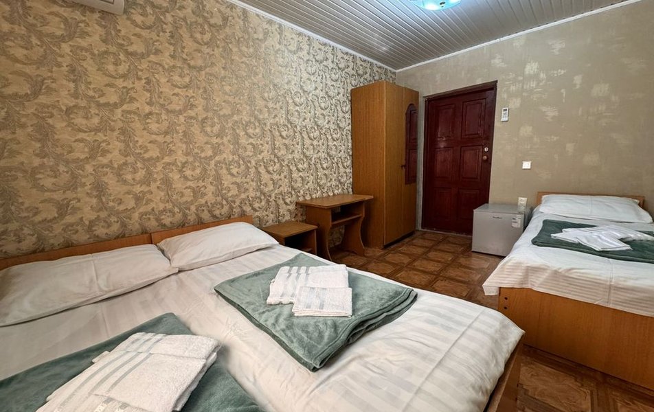 Трехэтажный корпус гостевого дома занимает закрытую озелененную территорию. Жилой фонд, рассчитанный на 50 отдыхающих, предлагает гостям номера Эконом с общим санузлом, а также номера Стандарт с собственной ванной комнатой и кондиционером.