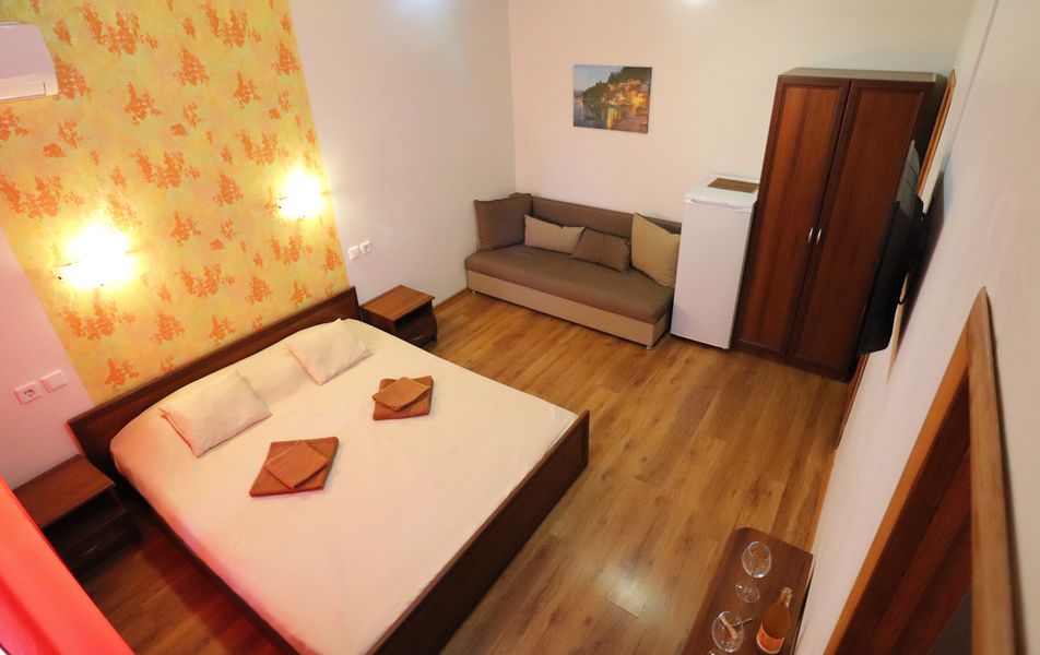 Гостям предлагаются разные варианты размещения: «Стандартные» однокомнатные номера на одного, двоих и троих гостей, а также «Семейные» двухкомнатные номера на четверых — как с кухней, так и без неё. Часть номеров оснащена террасой или балконом.