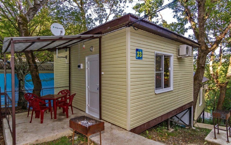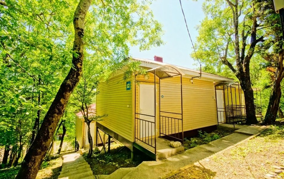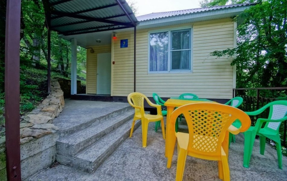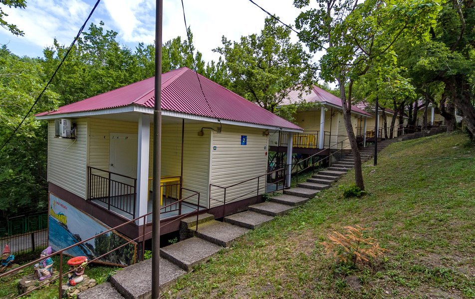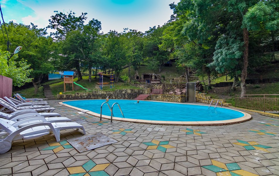 Вся территория базы гористая с большим перепадом высот. Сохранены все горные деревья (дубы, сосны). Чистейший горный воздух-главное преимущество и достоинство базы отдыха. На территории находятся: комфортабельные коттеджи; баня из калиброванной карельской сосны; две автостоянки; зоны отдыха с мангалами; бассейн 8х15 метров; столовая на 80 мест; детские площадки; бильярд, настольный теннис.