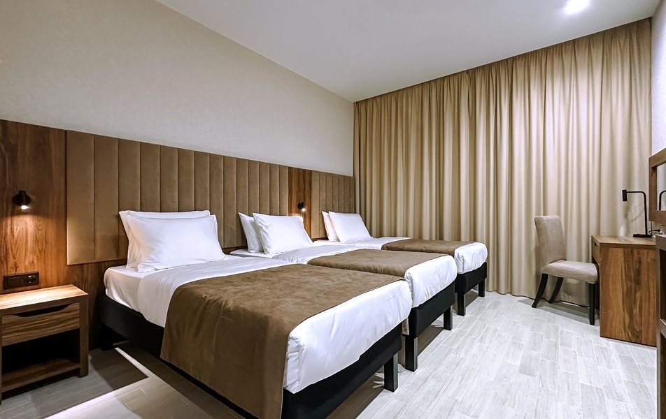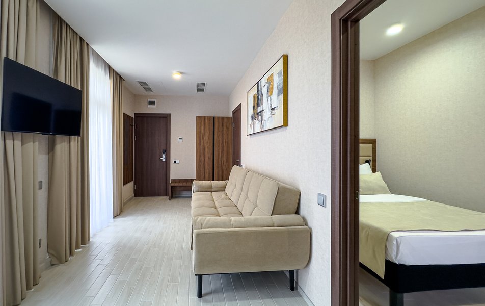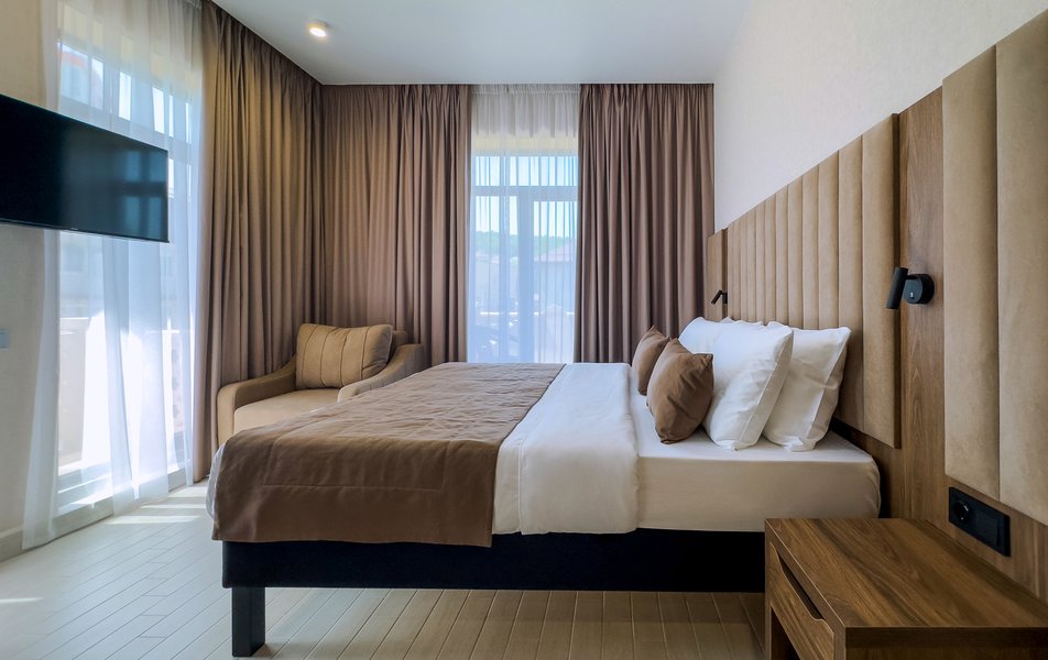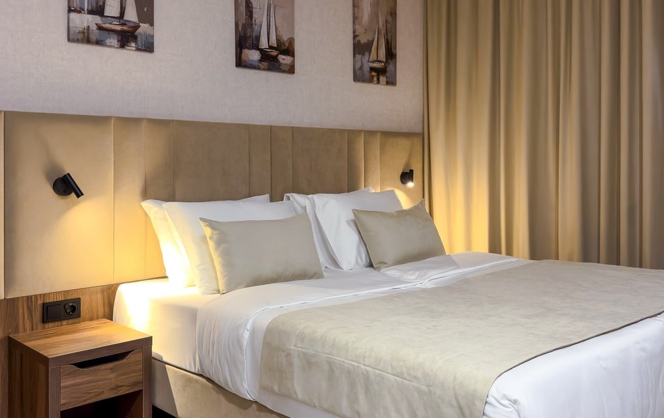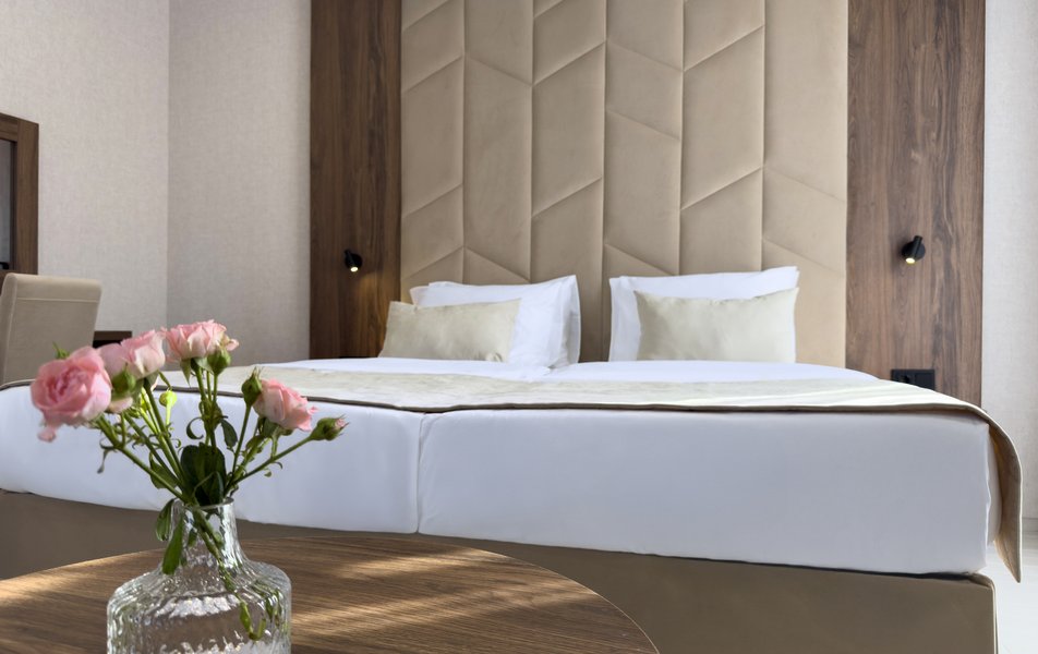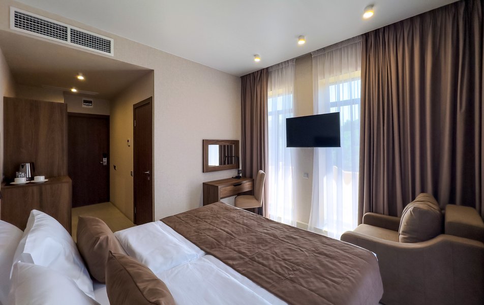 К размещению представлены несколько категорий: Стандарт, Супериор, Люкс и Апартаменты. Удобные кровати оборудованы мягким изголовьем. Также для вашего удобства в номерах имеются плотные шторы, прикроватные светильники, телевизор, вместительный шкаф и индивидуальный санузел с феном, полотенцами, гигиеническими средствами.