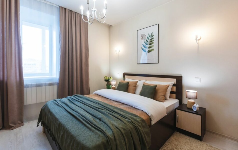 Апартаменты спроектированы для удобного и независимого проживания до шести человек. Две обособленные спальни с двуспальными кроватями и ортопедическими матрасами гарантируют полноценный отдых. В одной из спален организован рабочий уголок с письменным столом, а в другой – зона отдыха с телевизором. Просторная гостиная с раскладным диваном служит дополнительным спальным местом и пространством для общения, где можно насладиться просмотром фильмов на большом экране.