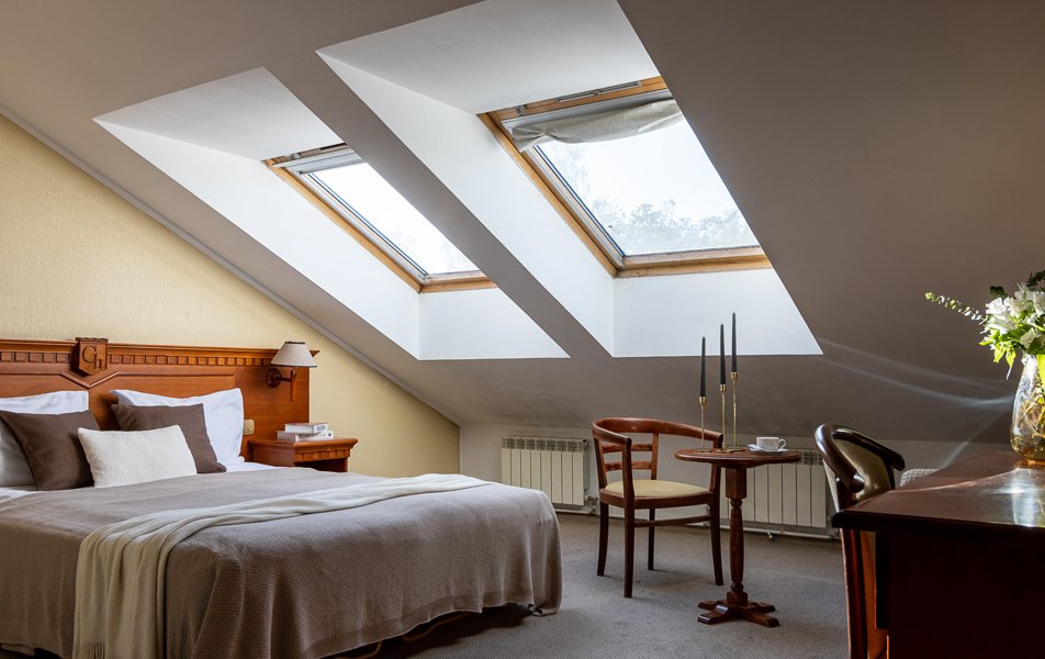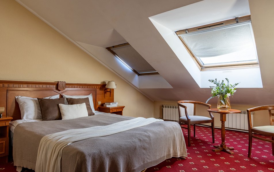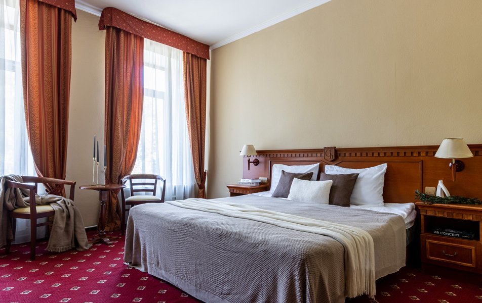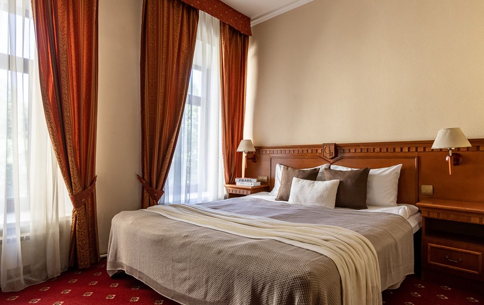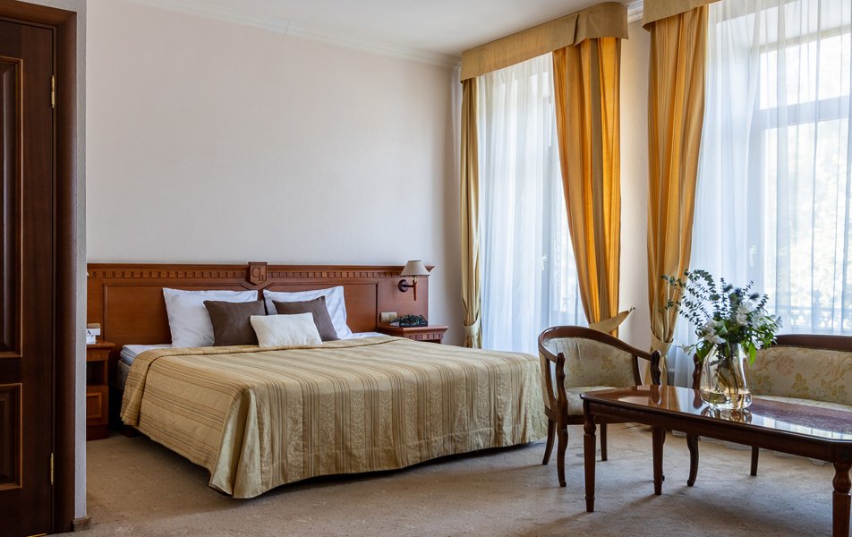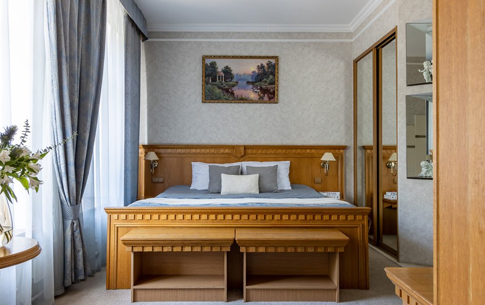 В архитектурном облике отеля изящно переплетаются элементы классики и современные тенденции. Из широких окон открывается захватывающая панорама на великолепный Дворцово-парковый ансамбль.
