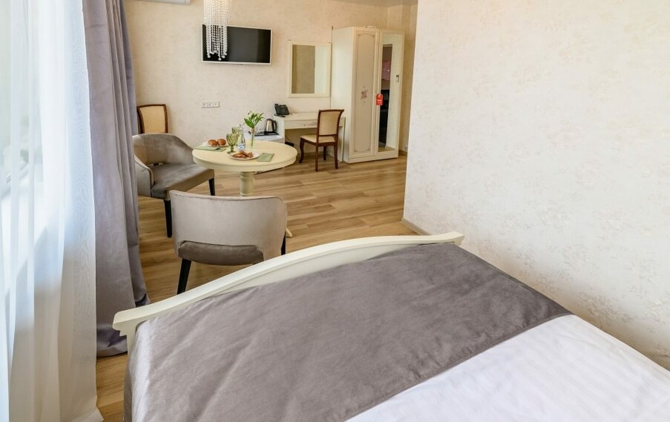 Номера отеля — тёплые, уютные, с естественными материалами и приглушённой, спокойной цветовой гаммой. В каждом чувствуется забота о деталях: удобная мебель, хорошее освещение, продуманное пространство. Есть варианты для разных запросов — от номеров для уединённого отдыха до просторных апартаментов и особого, романтично оформленного свадебного номера, где каждая деталь подчёркивает значимость момента.
