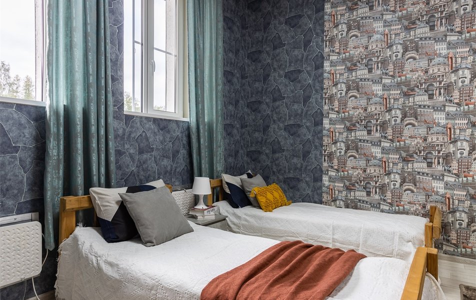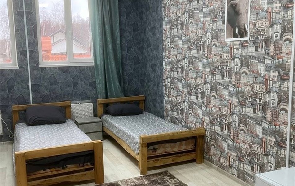 | Мебель | вешалка диван раскладной зеркало кровати односпальные: 3 кровать двуспальная прикроватные тумбочки стол стулья шкаф |