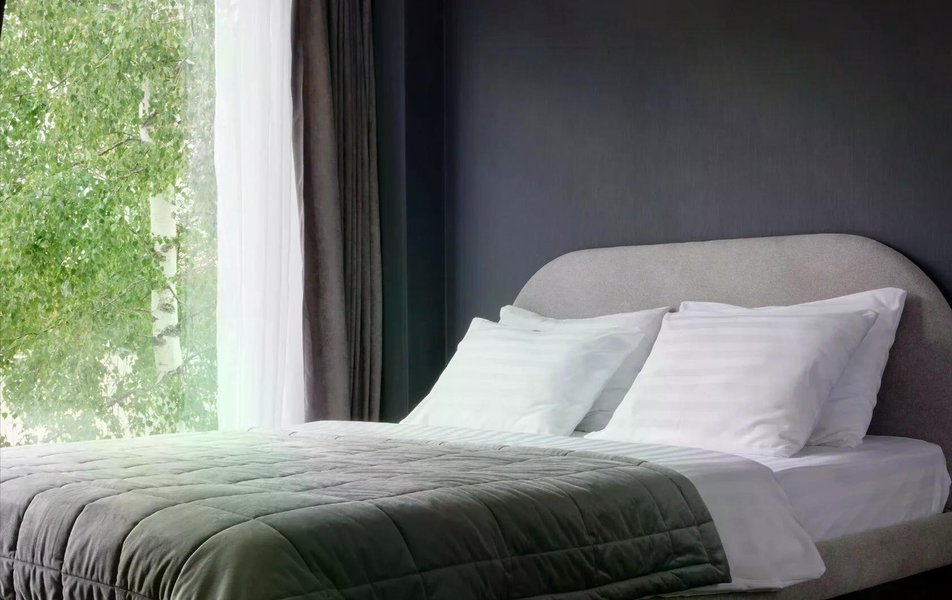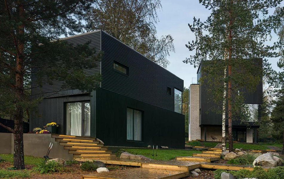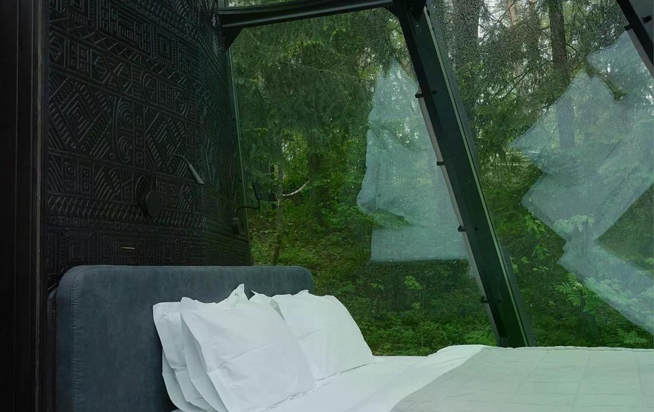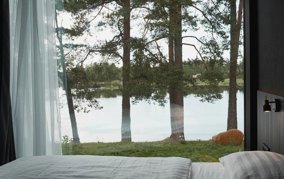Каждый дом отеля — это отдельная история, в которой панорамные окна открывают вид на раздольное течение реки, хвойные леса и причудливые карельские валуны. Архитектура зданий продумана до мелочей: окна направлены не только на горизонт, но и в небо, наполняя интерьеры мягким, естественным светом.