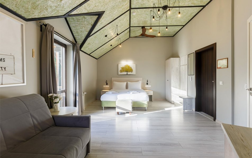 Территория гостиничного комплекса, расположенная в сосновом лесу, включает в себя отдельно стоящие двухэтажные гостевые дома и жилой корпус с номерами. В распоряжении гостей различные варианты размещения – есть стандартные комнаты, есть номера с собственной сауной или Апартаменты, оснащенные кухней. В каждом номере имеется индивидуальный санузел с душевой кабиной, фен, телевизор с плоским экраном, электрочайник.