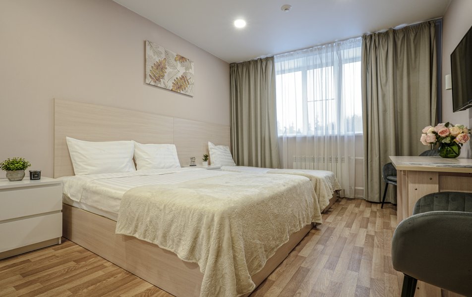 Гостям предлагаются уютные номера, где продуманный дизайн сочетается с практичностью. Номера оформлены в современном стиле, оснащены всем необходимым для отдыха или работы. Номер оборудован односпальными кроватями, телевизором с плоским экраном, шкафом, прикроватными тумбочками, рабочим столом, стулом, бра, санузлом с душем и косметическими принадлежностями.